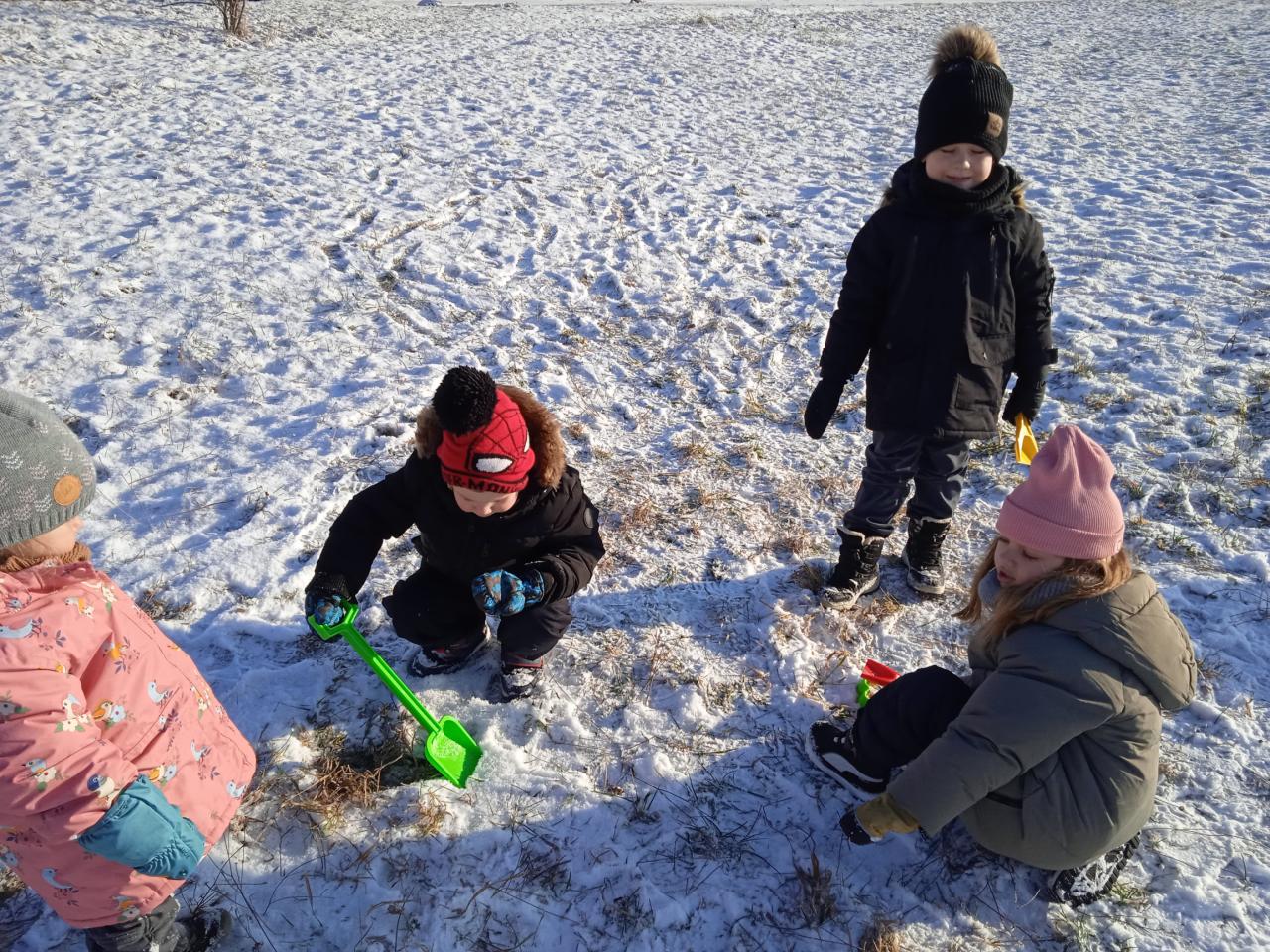 Dnes děti využily příjemně mrazivého počasí a šly si pohrát na louku, kde vyráběly ze sněhu bábovky. Krásně nám svítilo sluníčko, tak jsme si čas venku užili.