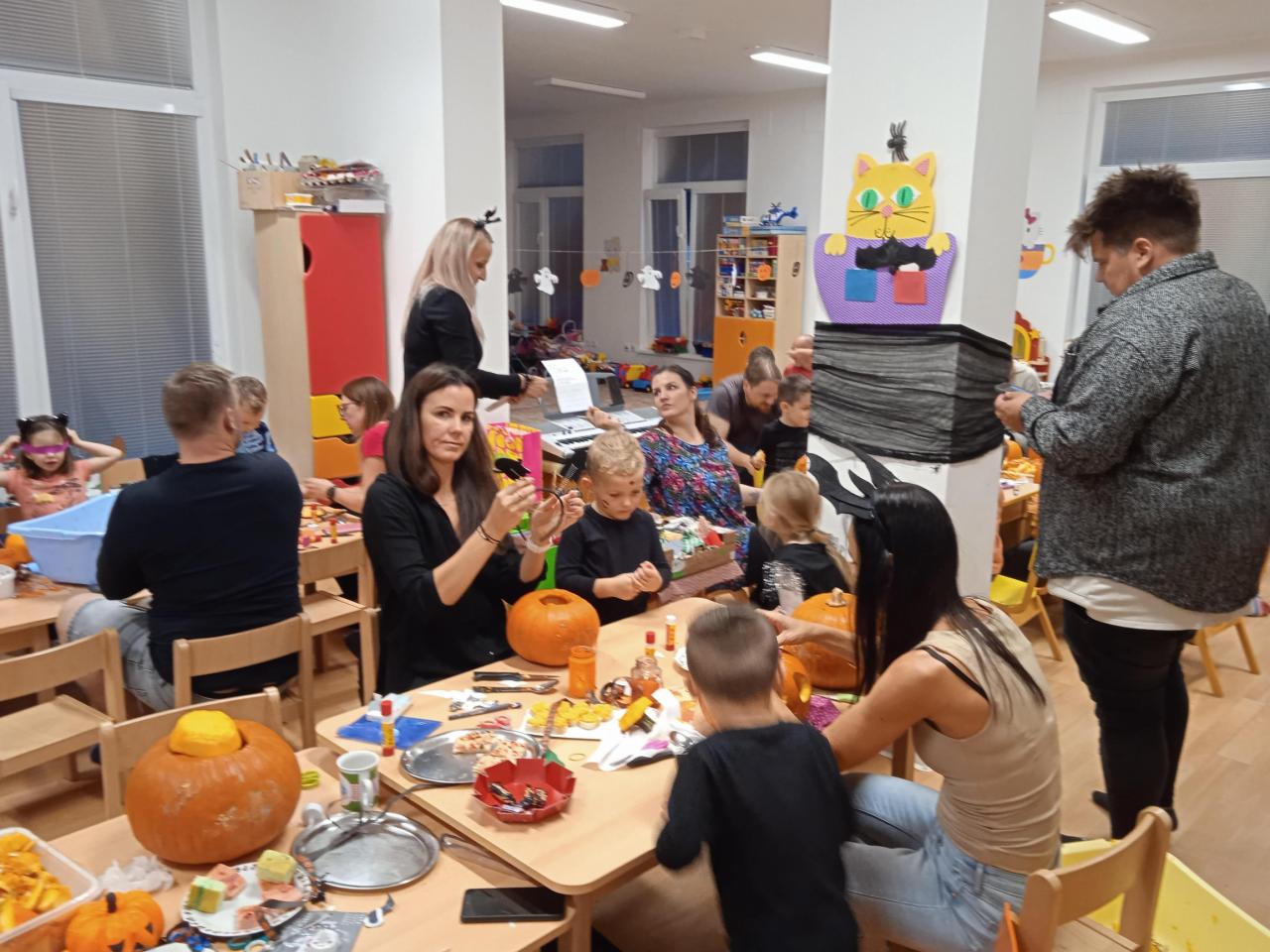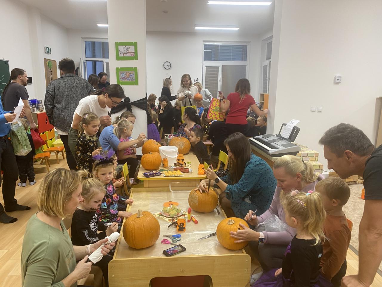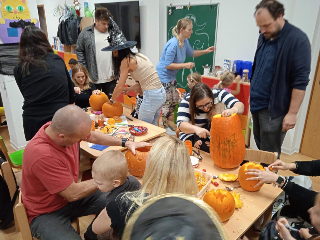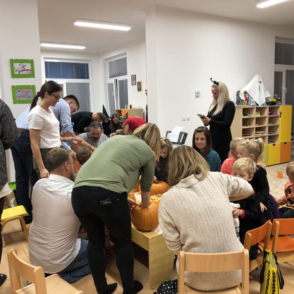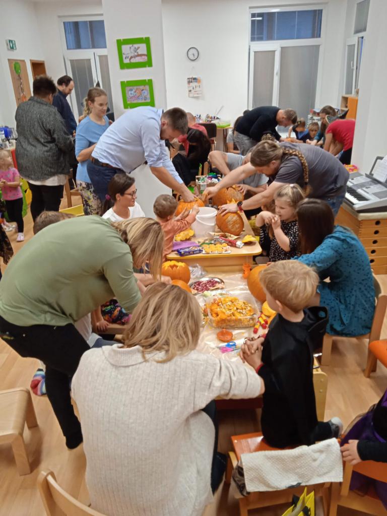 Děti ráno upekly pro rodiče "halloweenské buchty", které se jim moc povedly. Na besídce nejdříve zarecitovali a zazpívali rodičům nové podzimní básničky a písničky, při poslední "dýňové" využili vyrobené lampičky. Po představení všichni začali dlabat dýně a ochutnávat dobroty jak od dětí, ...