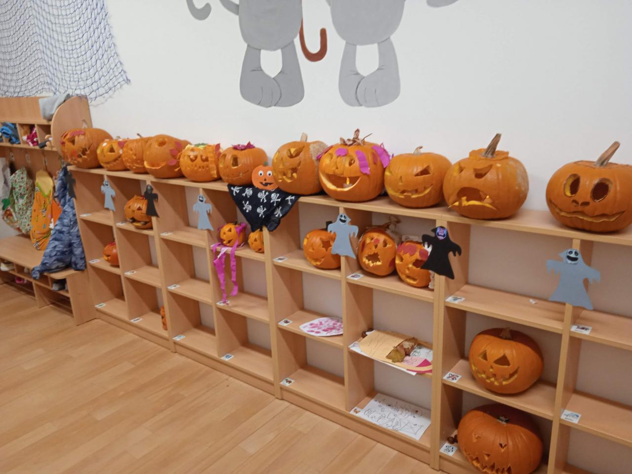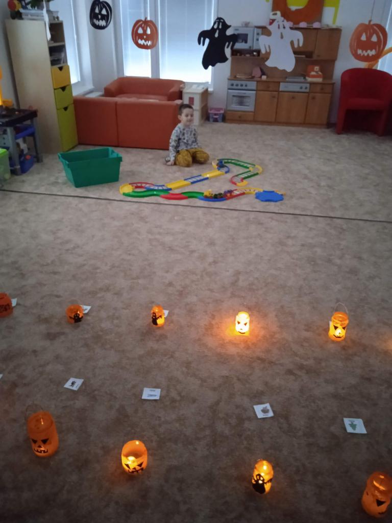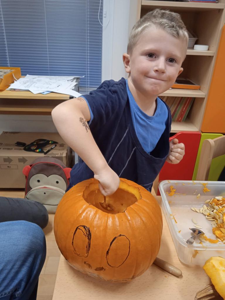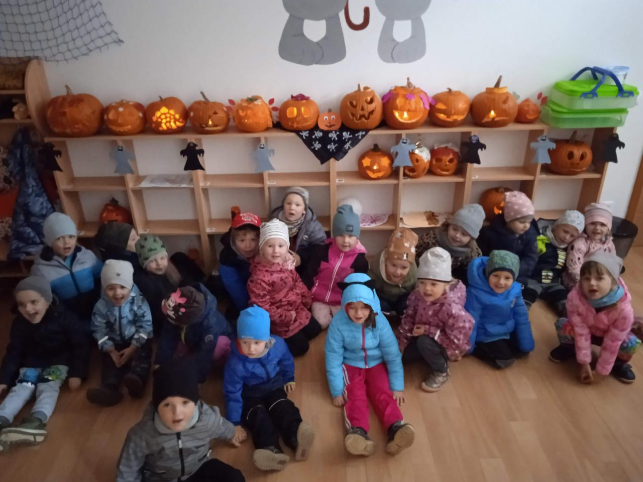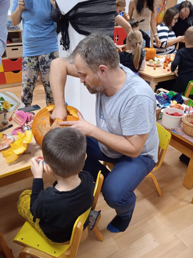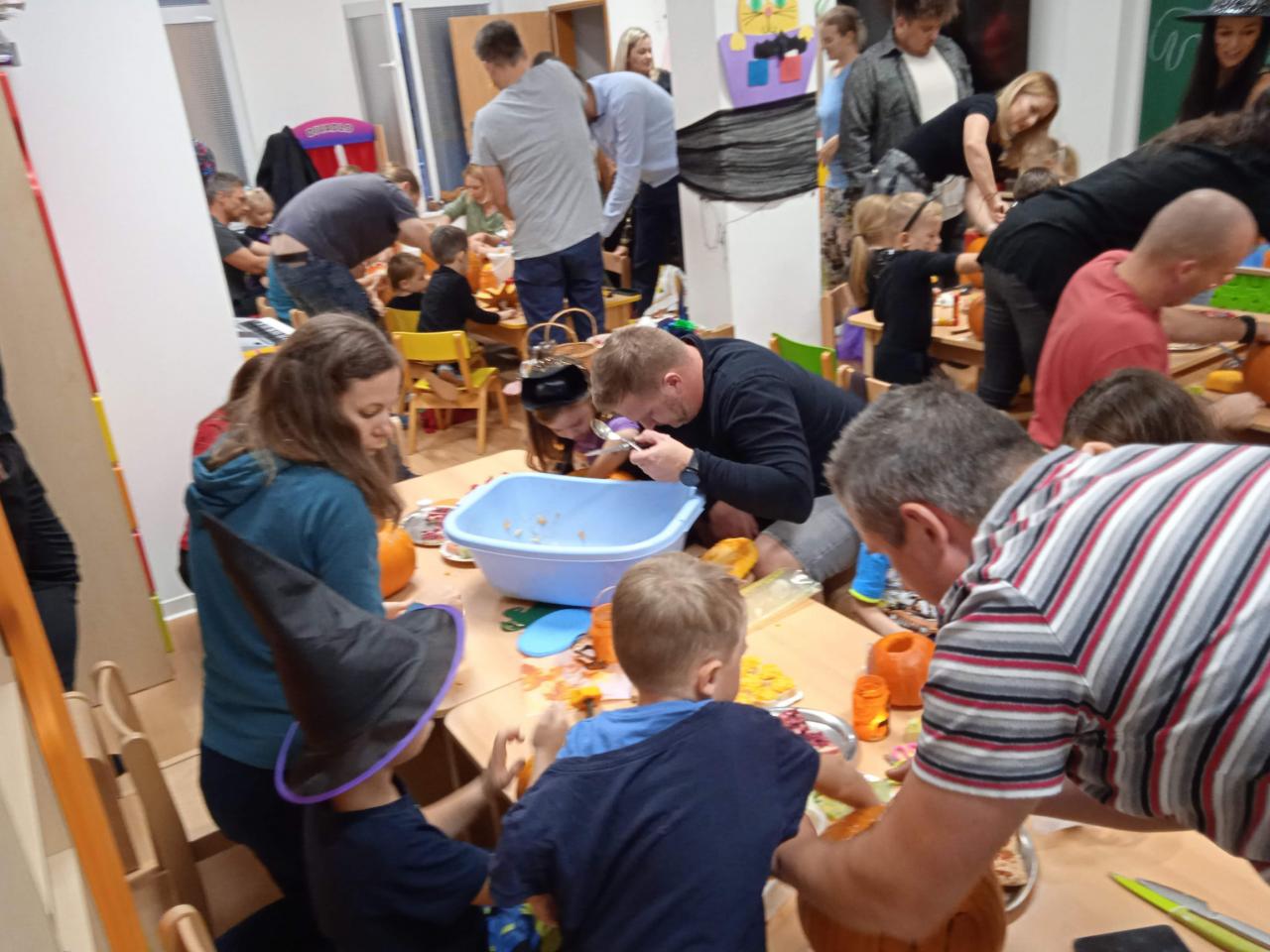 Děti ráno upekly pro rodiče "halloweenské buchty", které se jim moc povedly. Na besídce nejdříve zarecitovali a zazpívali rodičům nové podzimní básničky a písničky, při poslední "dýňové" využili vyrobené lampičky. Po představení všichni začali dlabat dýně a ochutnávat dobroty jak od dětí, ...