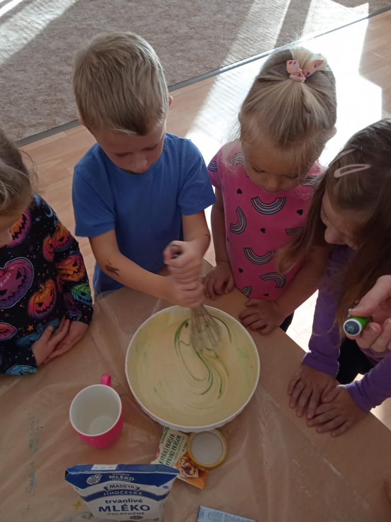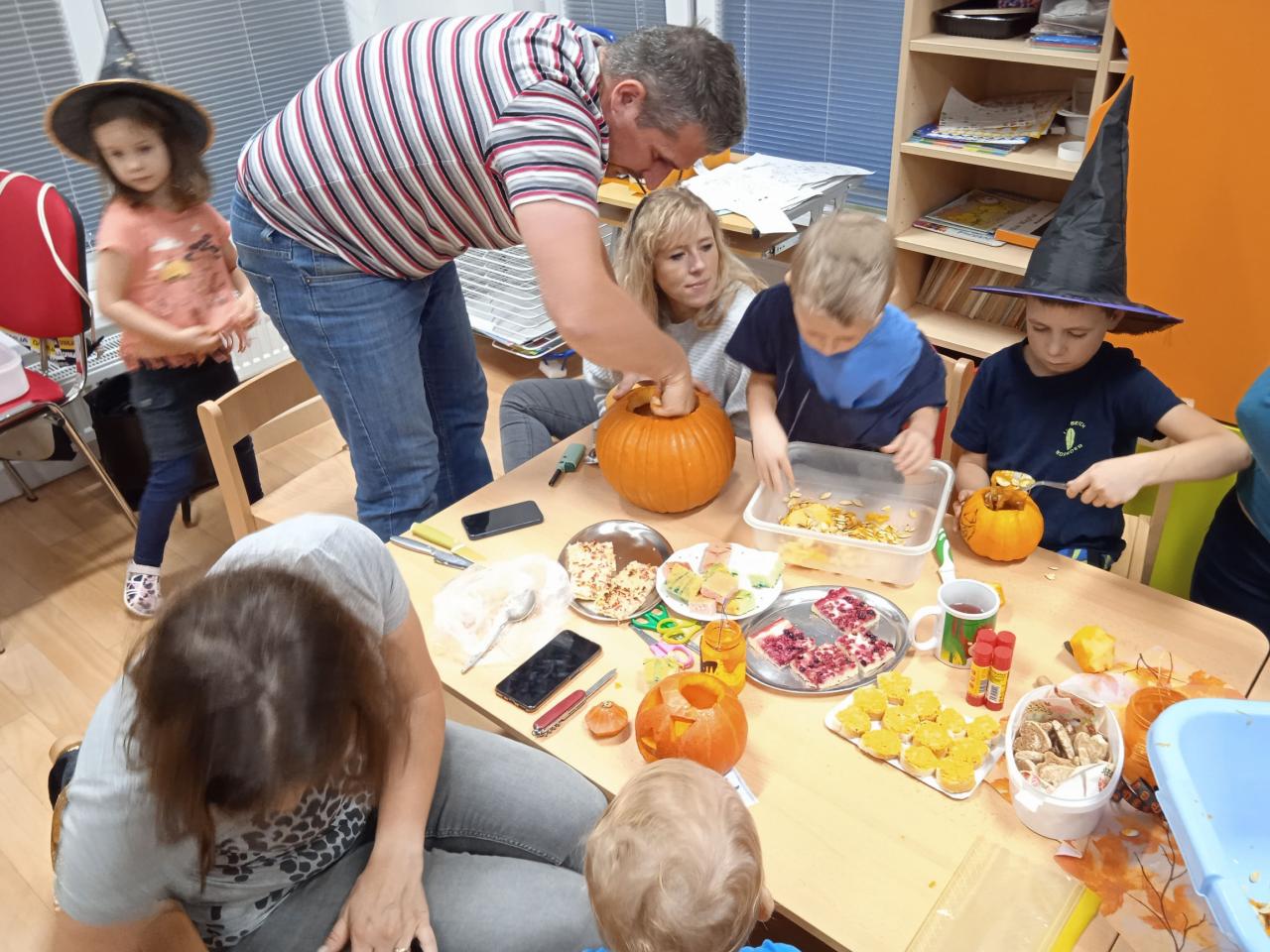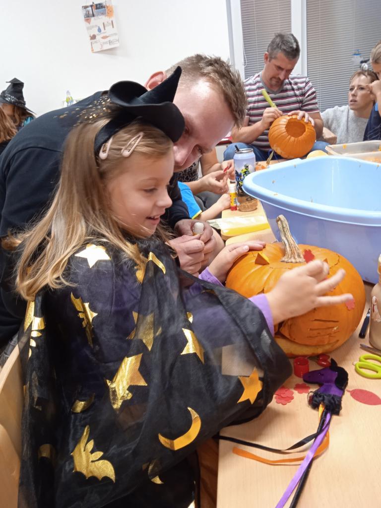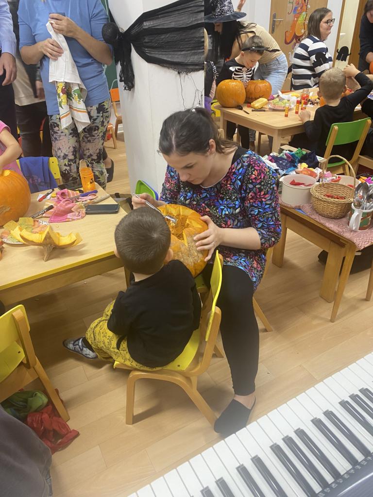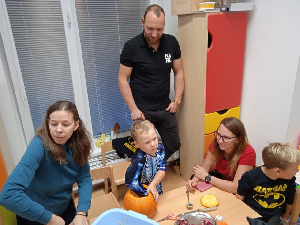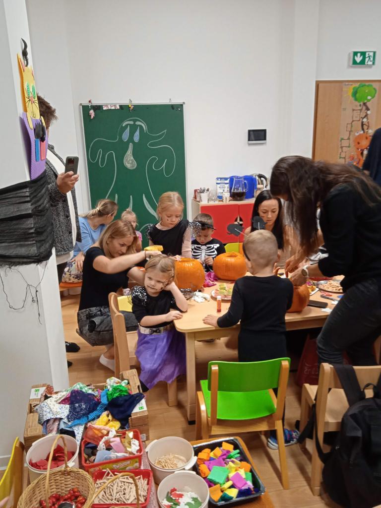 Děti ráno upekly pro rodiče "halloweenské buchty", které se jim moc povedly. Na besídce nejdříve zarecitovali a zazpívali rodičům nové podzimní básničky a písničky, při poslední "dýňové" využili vyrobené lampičky. Po představení všichni začali dlabat dýně a ochutnávat dobroty jak od dětí, ...