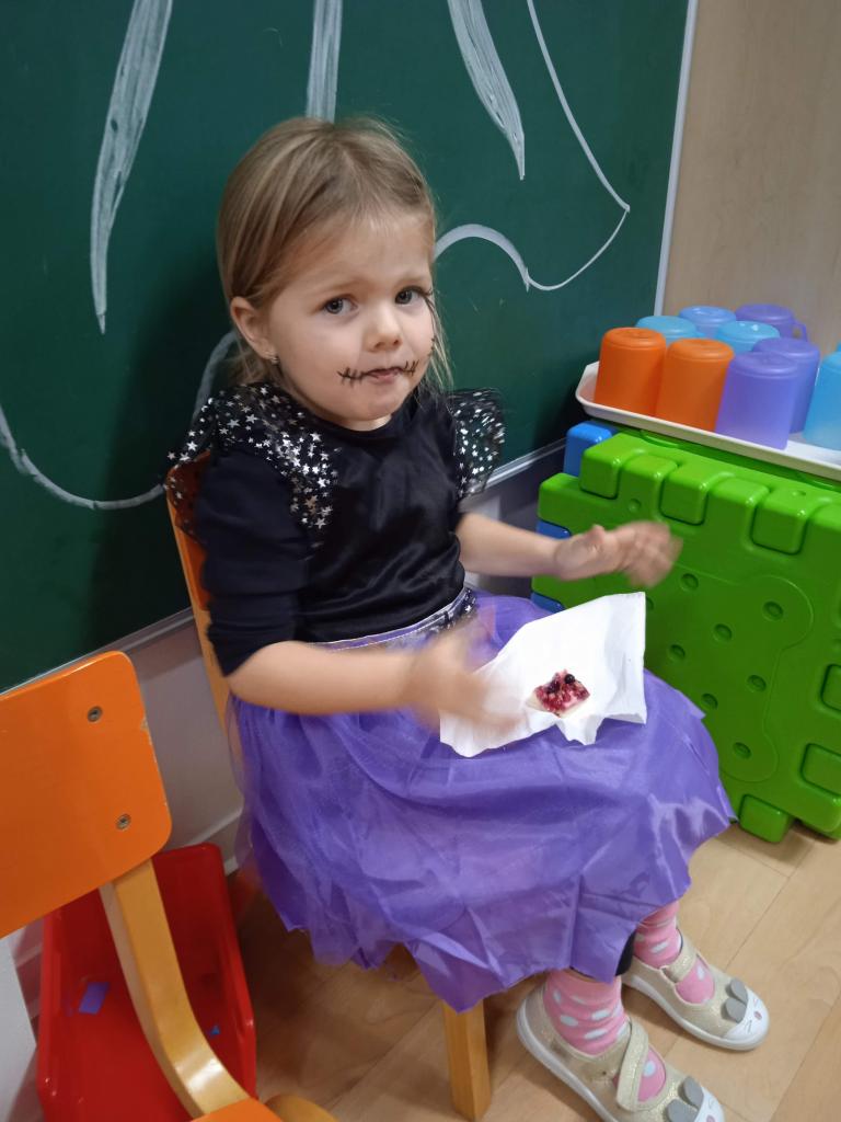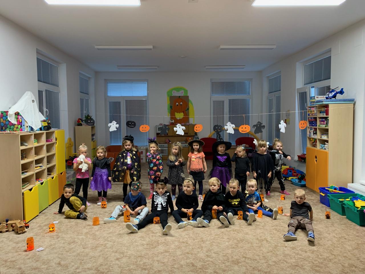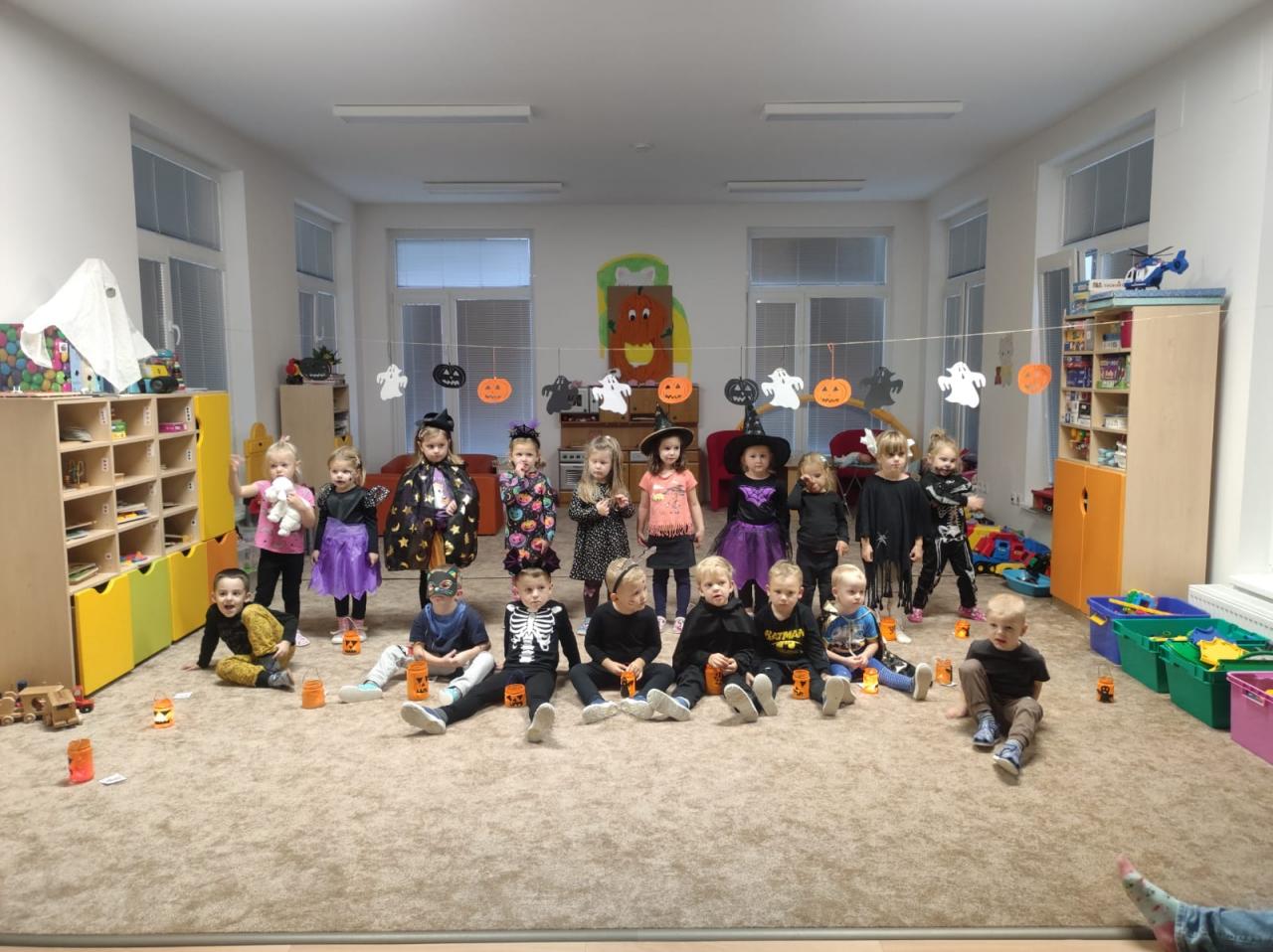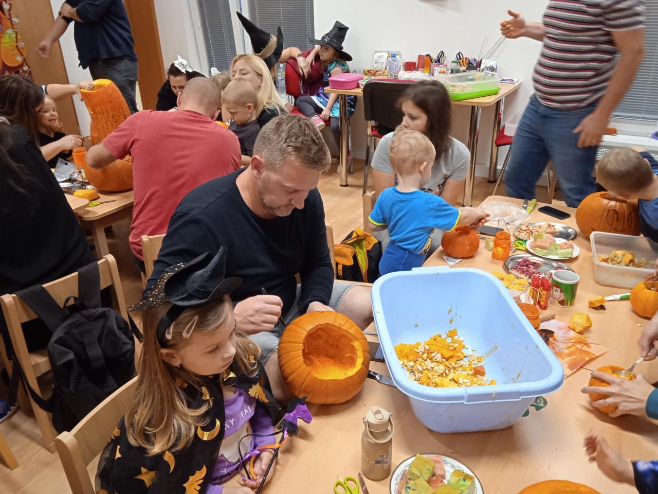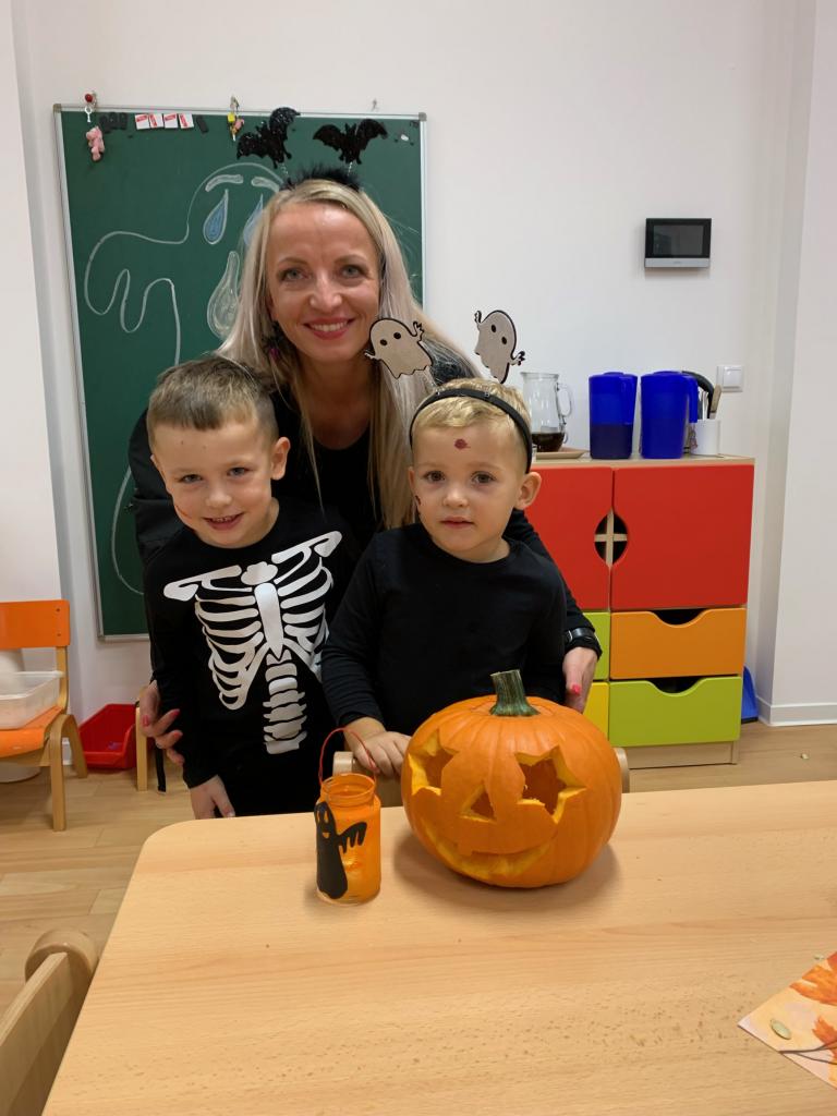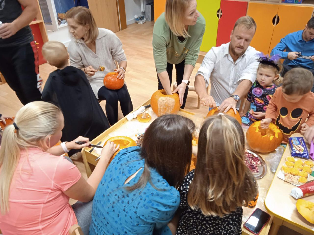 Děti ráno upekly pro rodiče "halloweenské buchty", které se jim moc povedly. Na besídce nejdříve zarecitovali a zazpívali rodičům nové podzimní básničky a písničky, při poslední "dýňové" využili vyrobené lampičky. Po představení všichni začali dlabat dýně a ochutnávat dobroty jak od dětí, ...