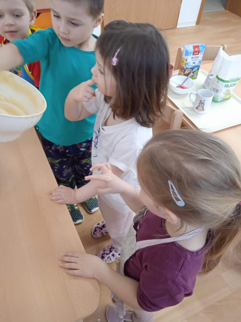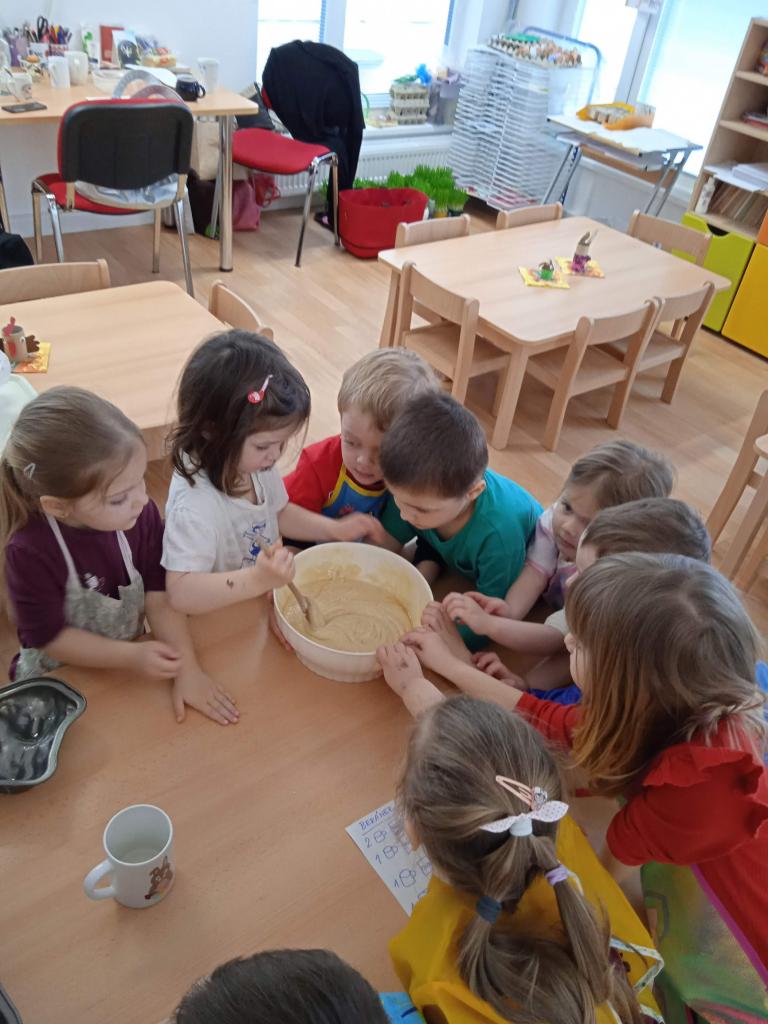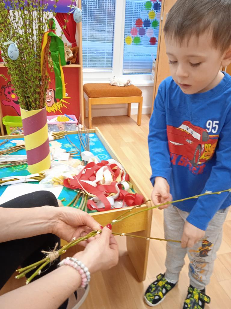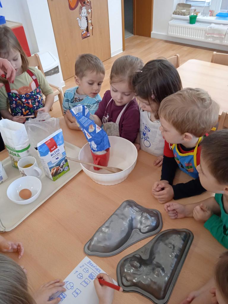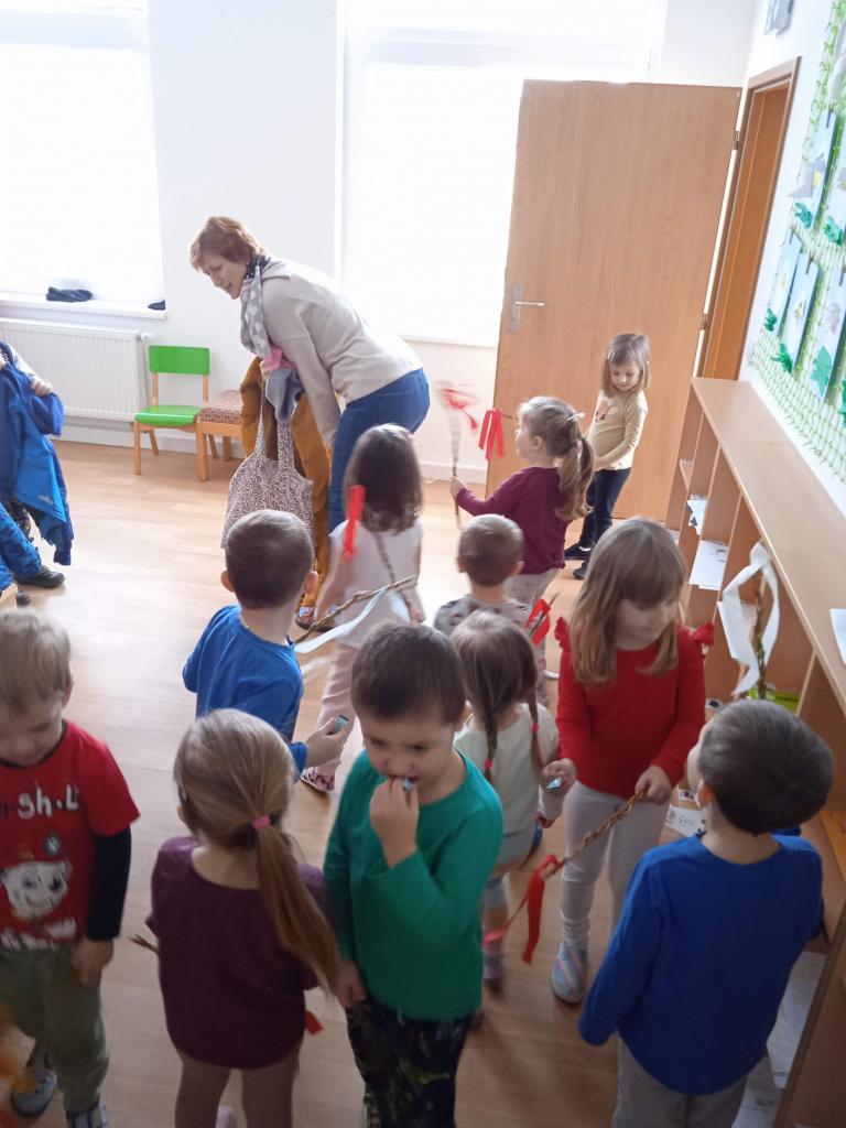 .. Další týden si děti zkusily zaplétání pomlázek ze tří proutků s dopomocí paní učitelky, uplekly si dva beránky, dozvěděly se o velikonočních tradicích a a vyzkoušely si šupání ve školce, kde si vykoledovaly malou sladkost u Soviček, u kuchyně i ve své třídě. Děti vše bavilo, zejména barvení vajíček a pečení beránka s ochutnávkou těšta (dbali jsme na zvýšenou hygienu).