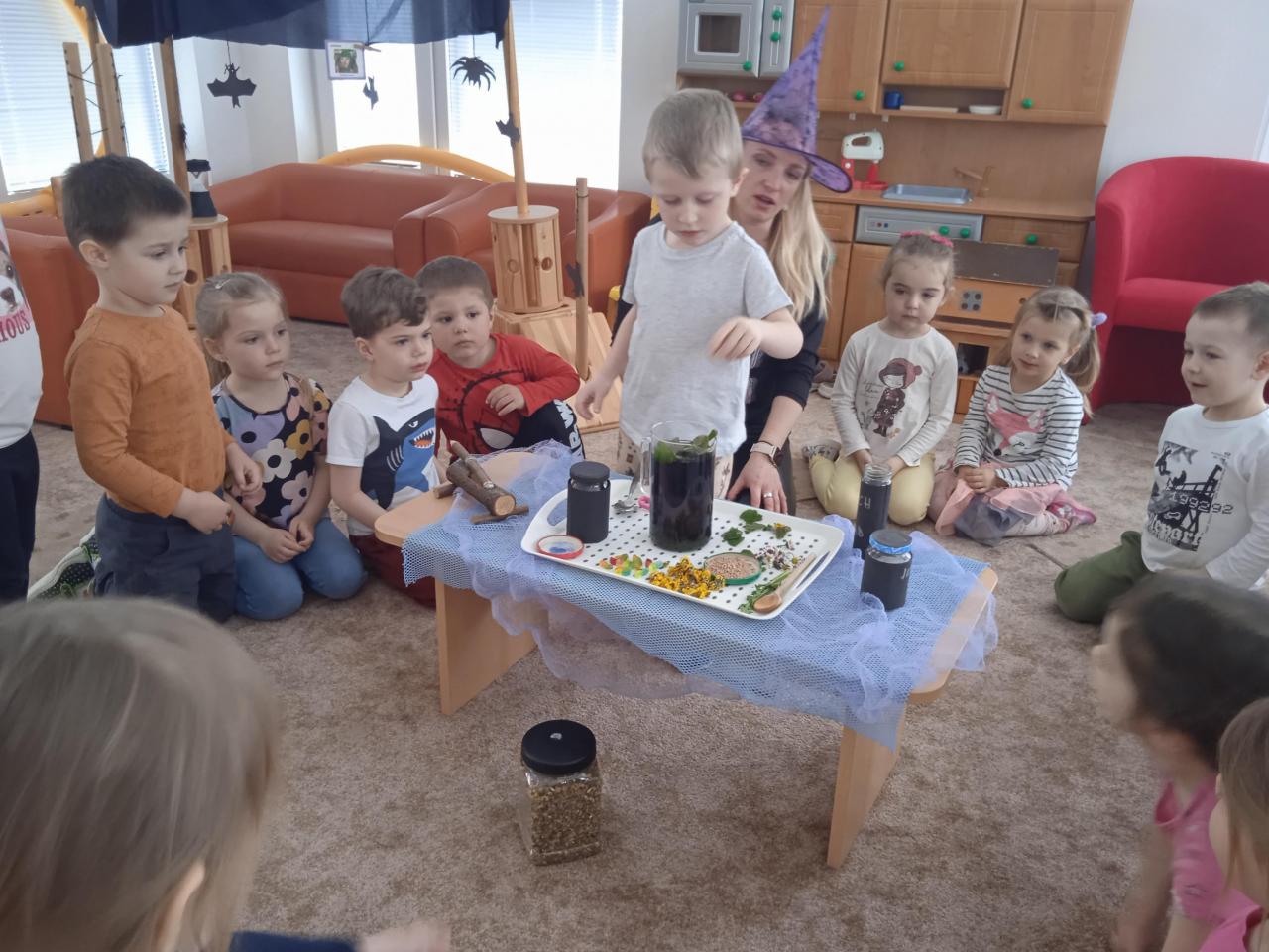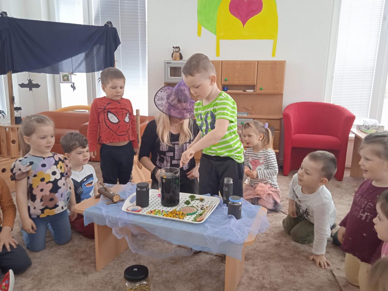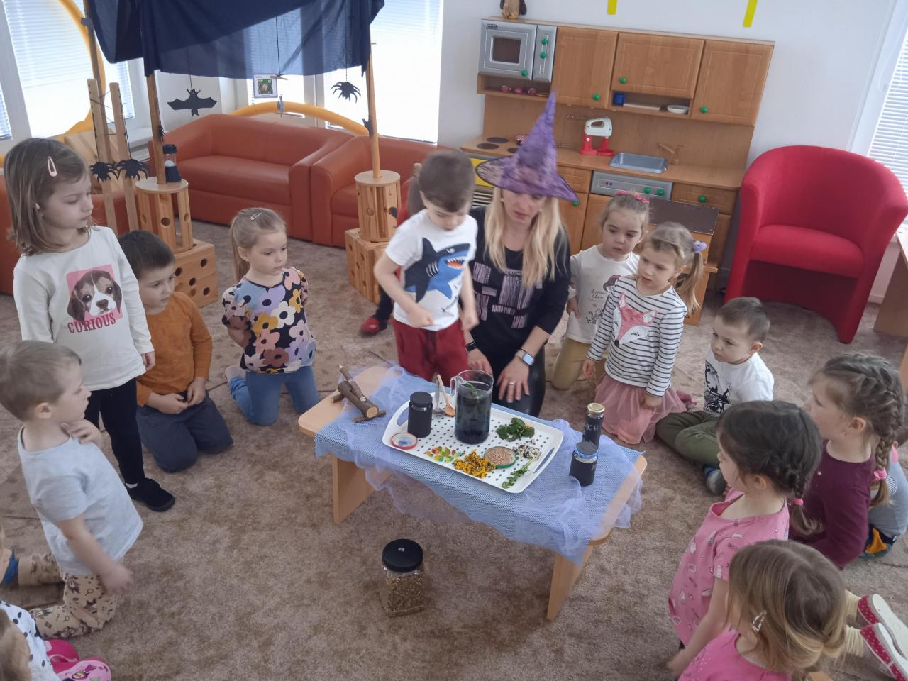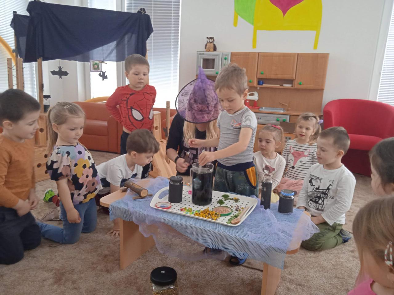 Celý týden se Koťátka věnovala problematice čarodějnictví, vše začalo oslavou narozenin čarodějnice Julinky, potom bylo na programu mj. vaření lektvarů - jak papírových, tak barevných(míchaní barev a vznik jiných) či teplých, pátek završil soutěží o nejoriginálnější koště -