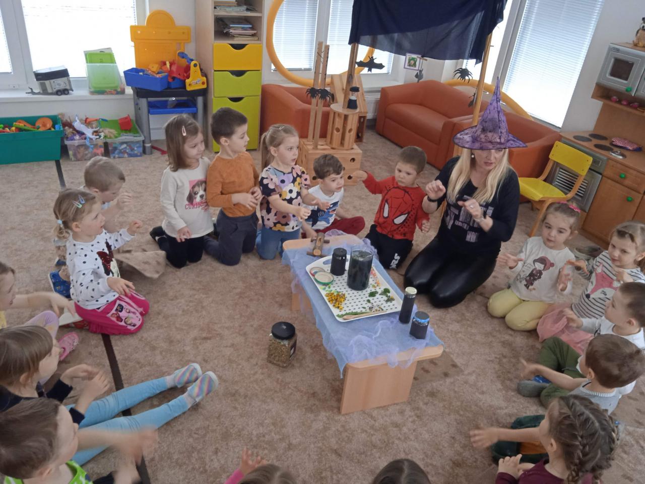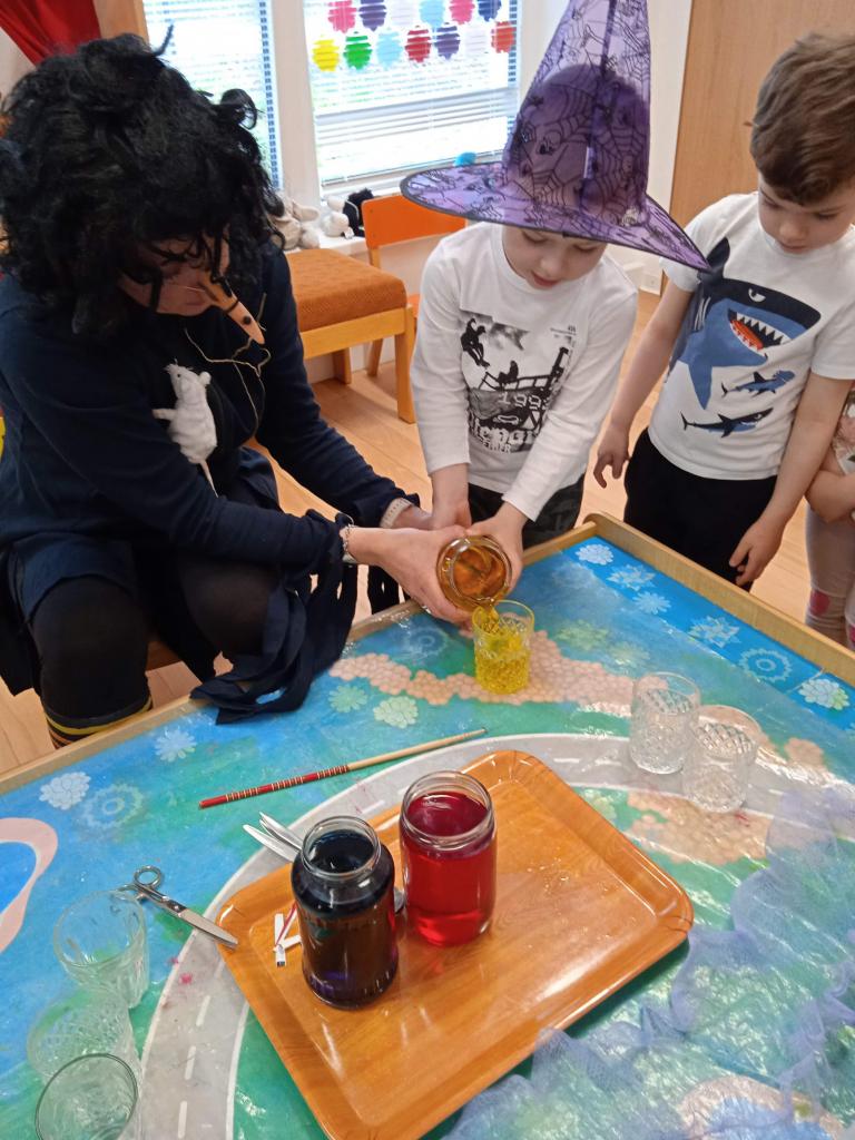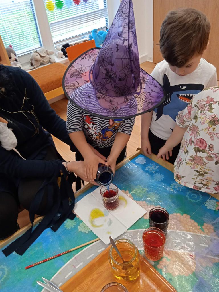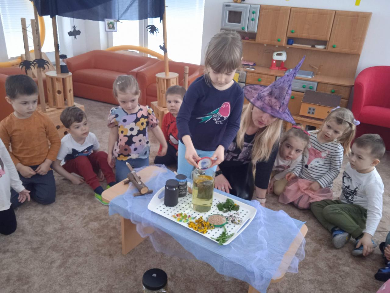 Celý týden se Koťátka věnovala problematice čarodějnictví, vše začalo oslavou narozenin čarodějnice Julinky, potom bylo na programu mj. vaření lektvarů - jak papírových, tak barevných(míchaní barev a vznik jiných) či teplých, pátek završil soutěží o nejoriginálnější koště -