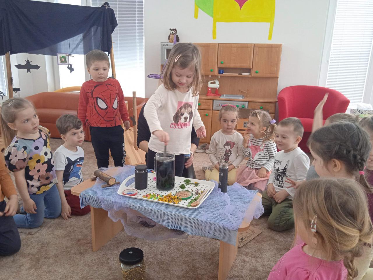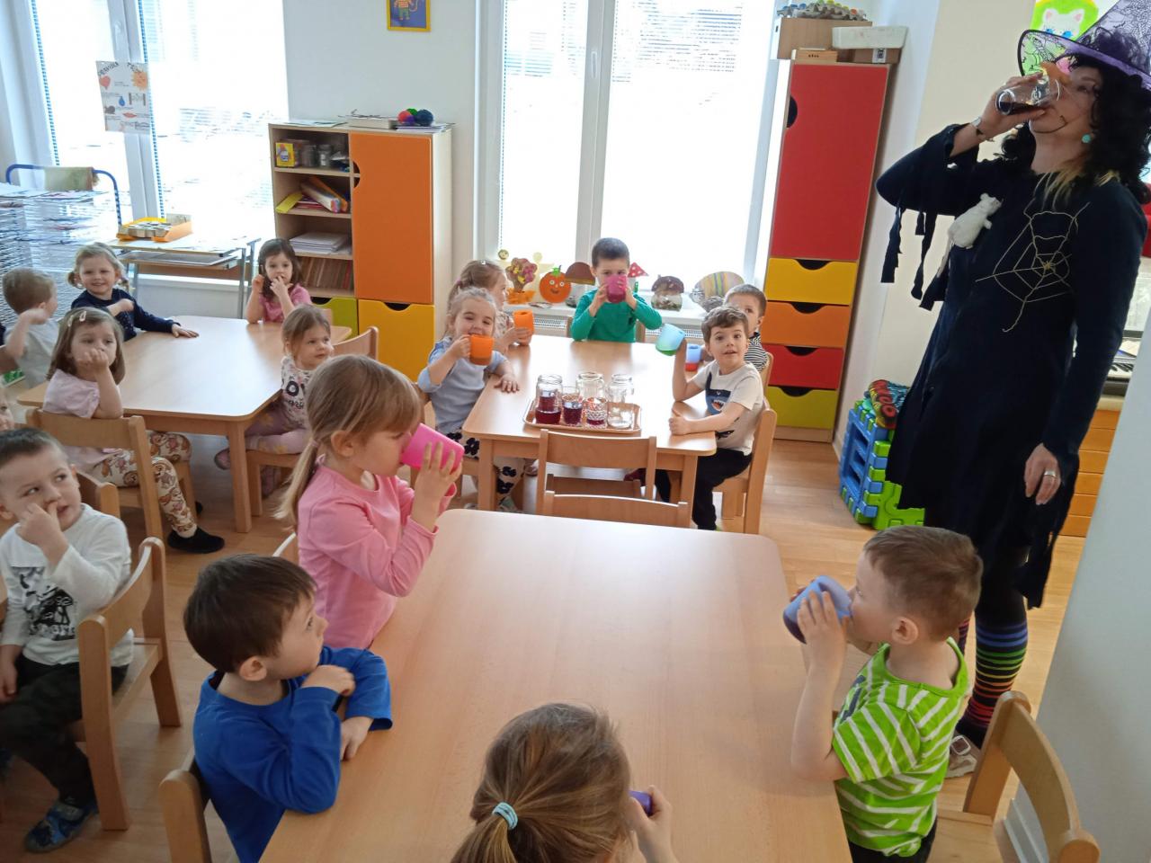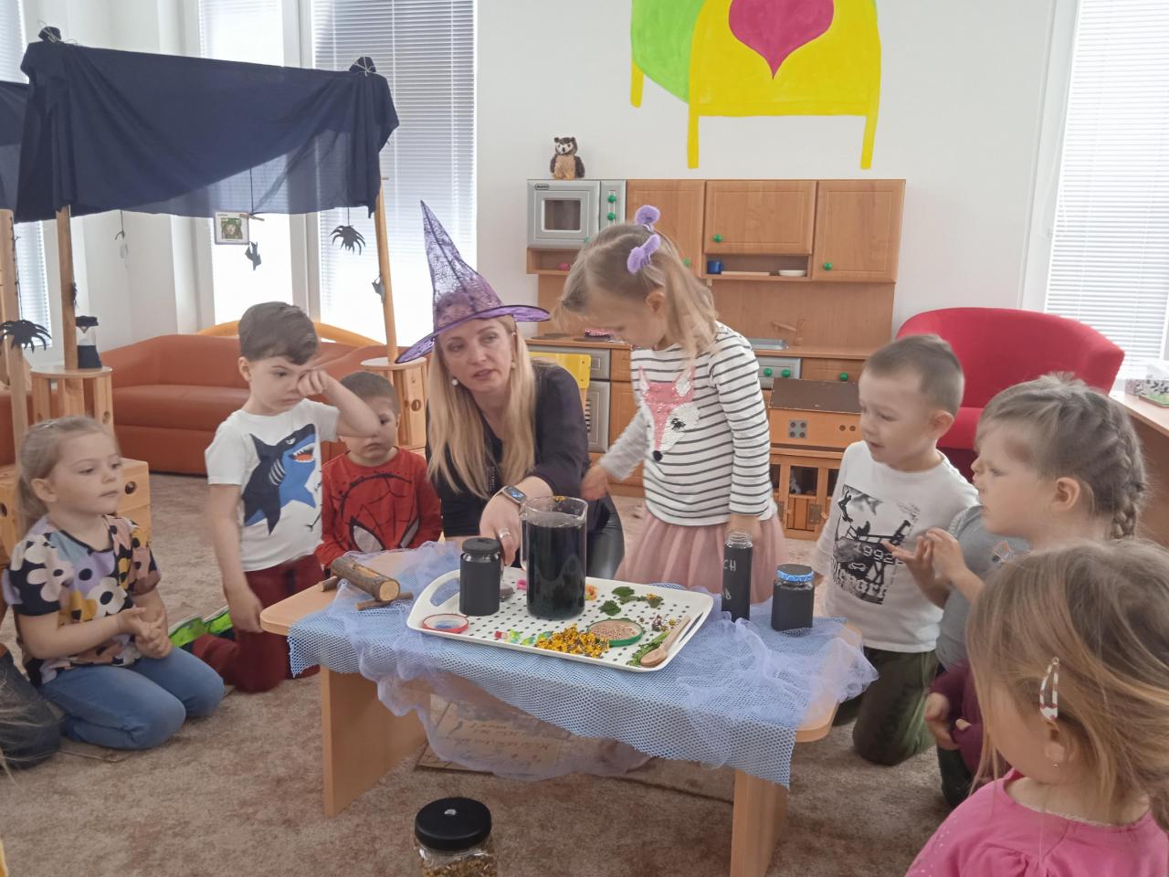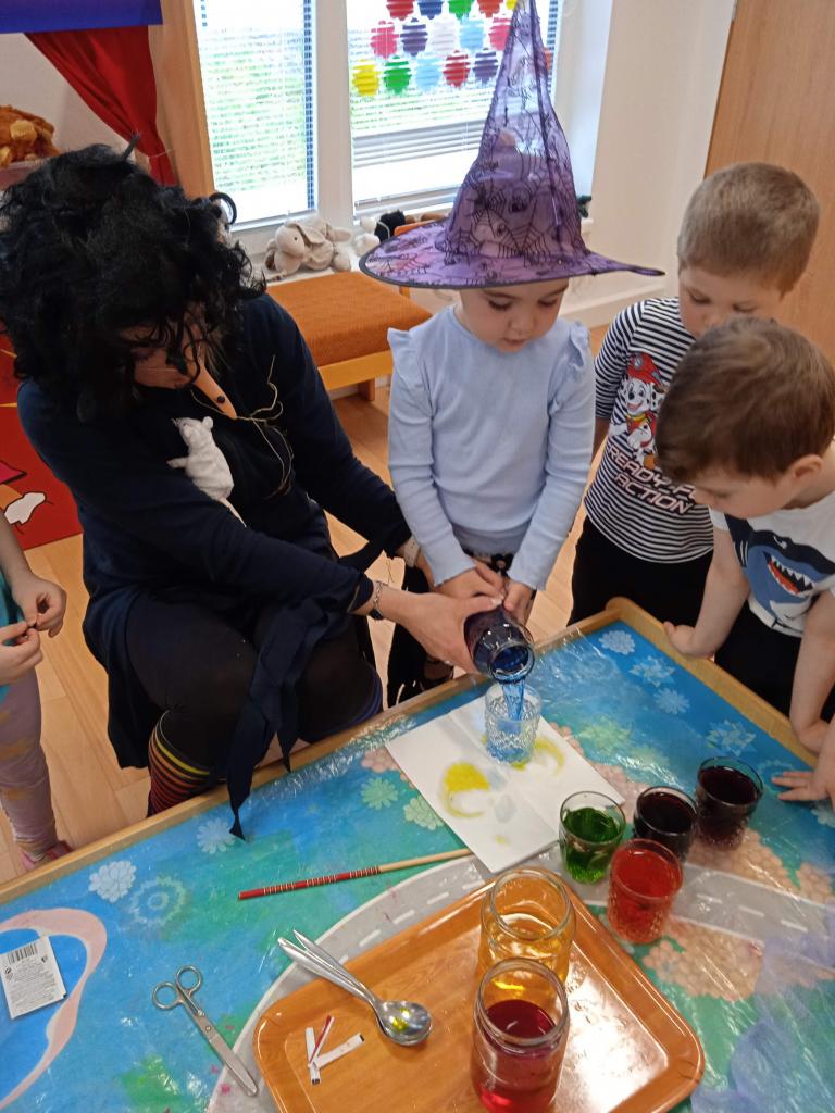 Celý týden se Koťátka věnovala problematice čarodějnictví, vše začalo oslavou narozenin čarodějnice Julinky, potom bylo na programu mj. vaření lektvarů - jak papírových, tak barevných(míchaní barev a vznik jiných) či teplých, pátek završil soutěží o nejoriginálnější koště -