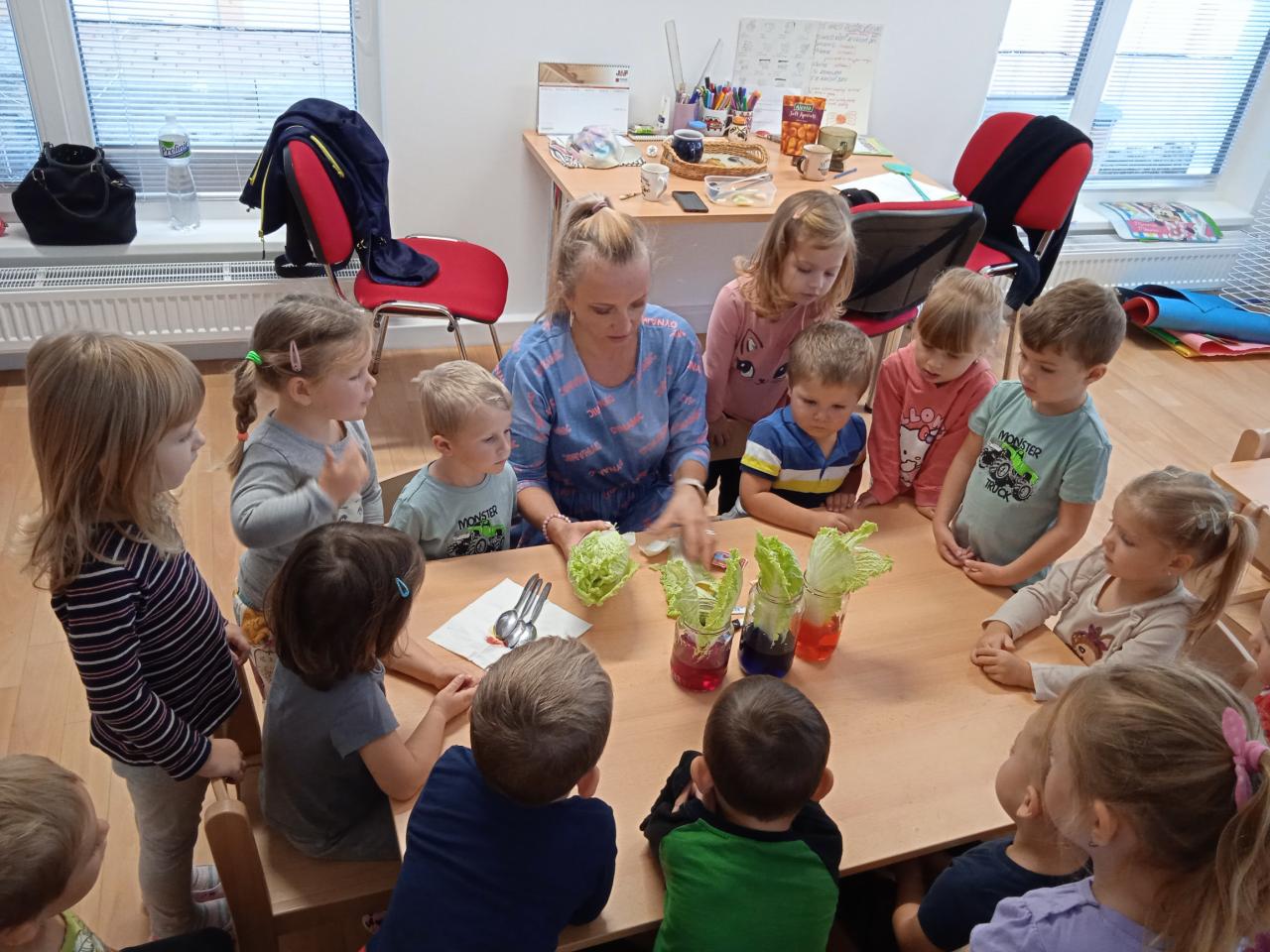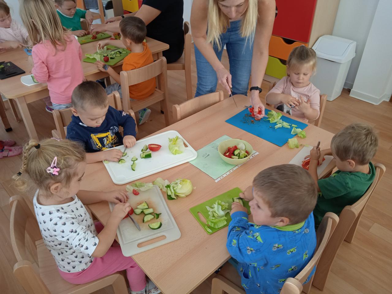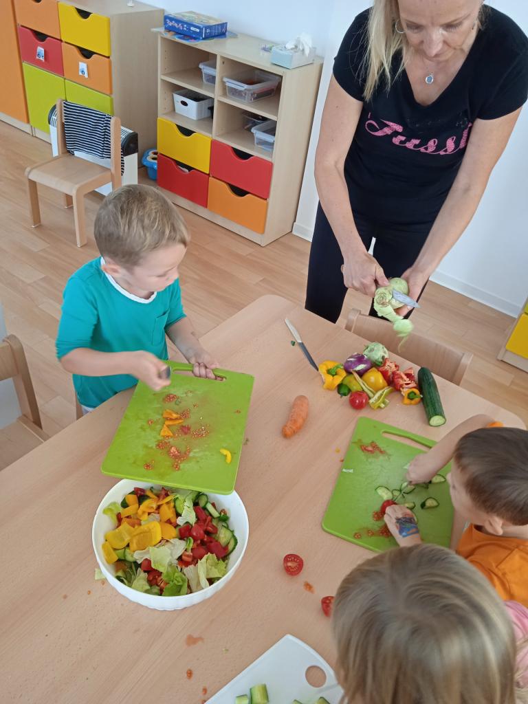 Celý týden děti poznávaly různé druhy zeleniny, nakrájely některé na salát, který jsme snědly, ostatní ochutnávaly, Ti statečnější i syrový brambor nebo petrželku :) dělaly jsme pokusy s ledovým salátem a vyráběly :)