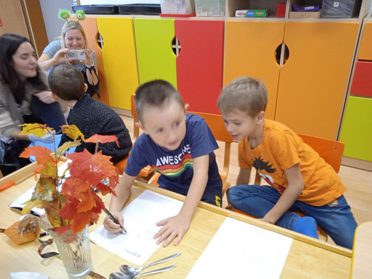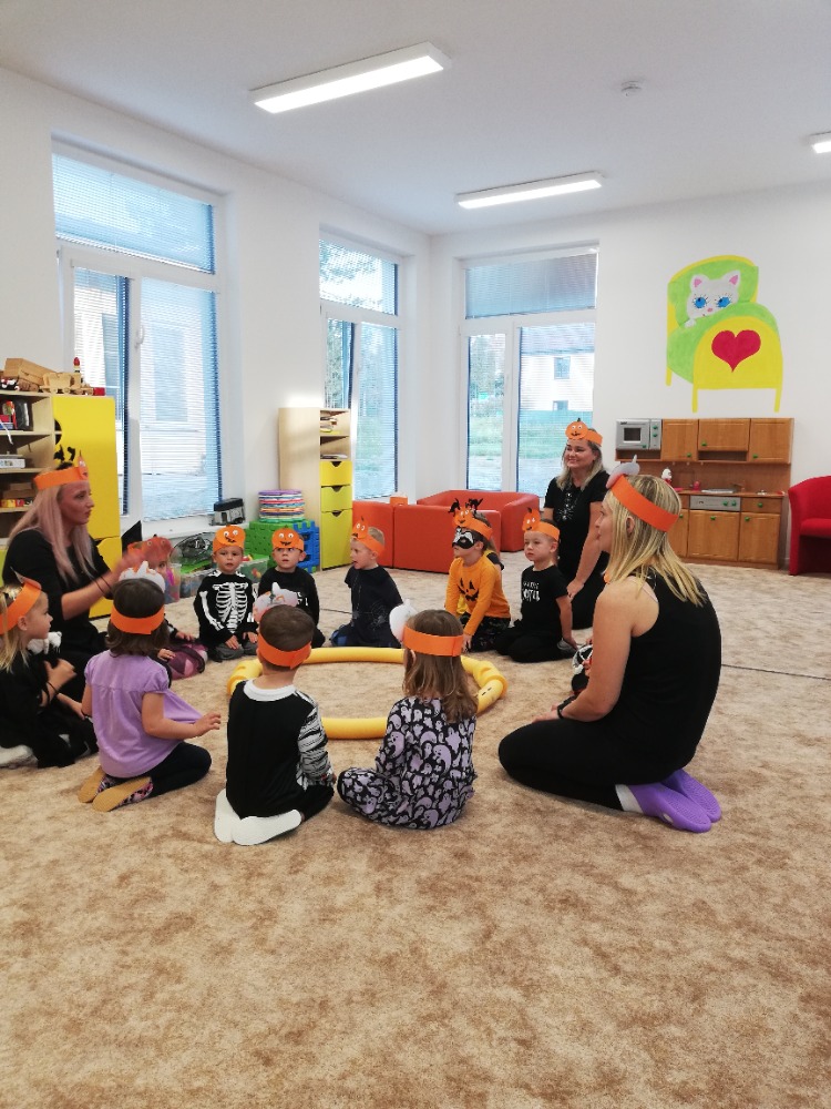 Celých 14 dní se neslo v duchu písně "Tři malé dýně", kdy jsme se s dětmi naučili něco zajímavého o dýních, zpívali, říkali básničky, hrály hry a navštěvovali vyřezané dýně u domovů dětí. Vše jsme zakončili besídkou "Dlabání dýní s rodiči", kdy dopoledne děti upekly dezert a odpoledne jsme dlaba