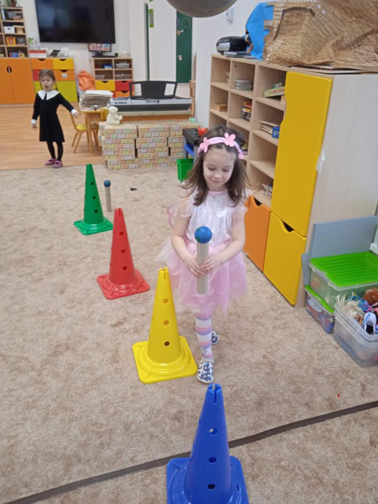 Děti si zasoutěžily ve skupinkách v různých disciplínách: hod míčem do koše, slalom s míčkem na roličče, tanec a chůze