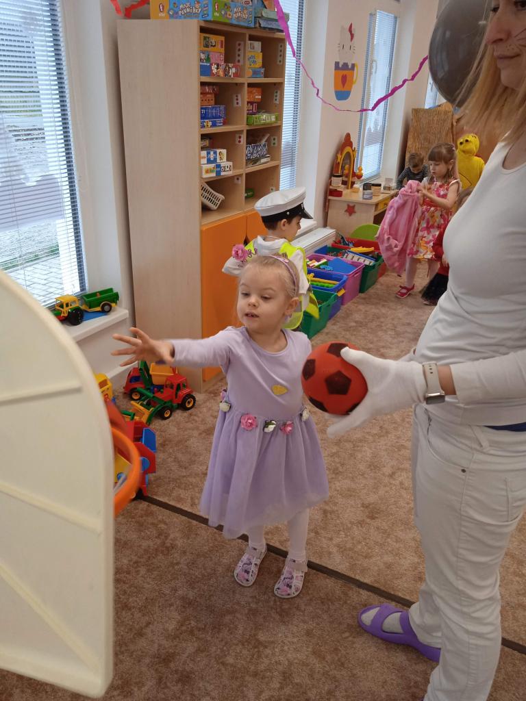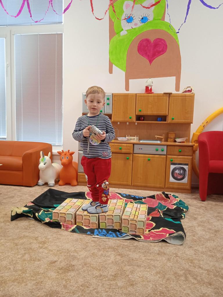 ... ve dvojicích s balónkem na břiše. Společně jsme si zahrály "vyřazovanou" na hudbu a pinkání nafouklých balónků. Ve třídě nás navštívily Sovičky, které nám zazpívaly píseň Já jsem muzikant a Koťátka naoplátku zazpívaly tu samou písničku Sovičkám, akorát v jiném provedení. Nakonec děti dostaly medaili, škrabošku a něco na zub za perfektní výkony.