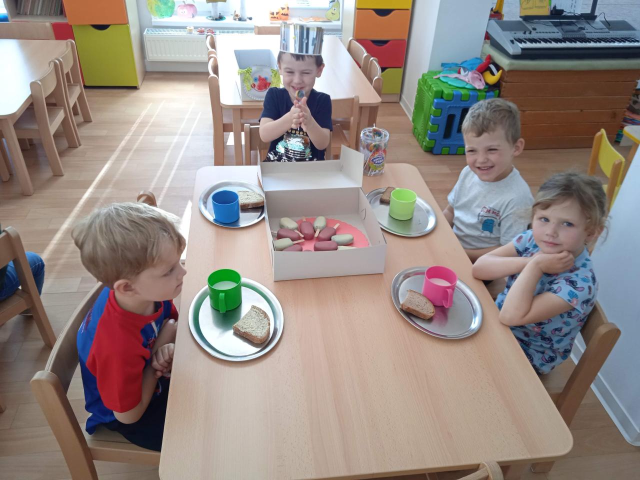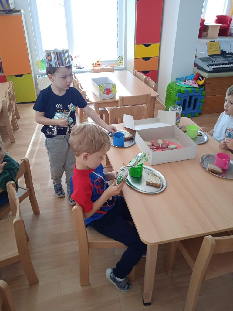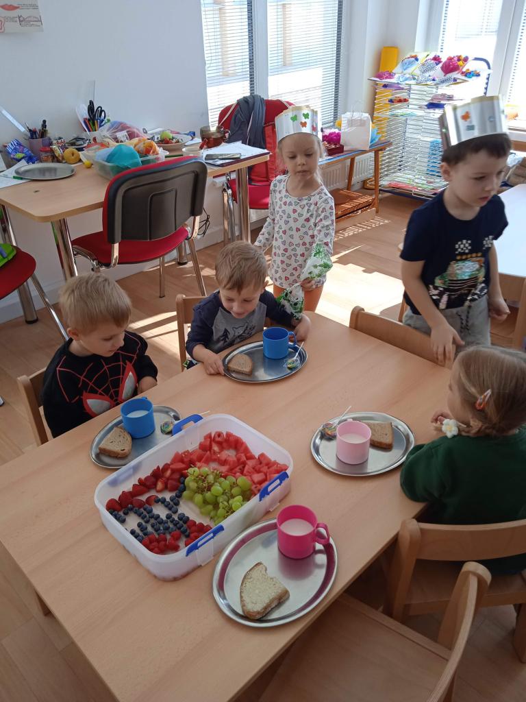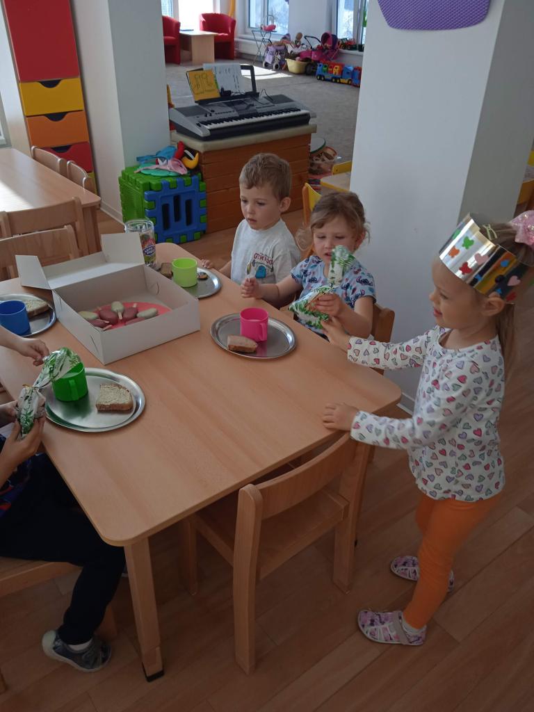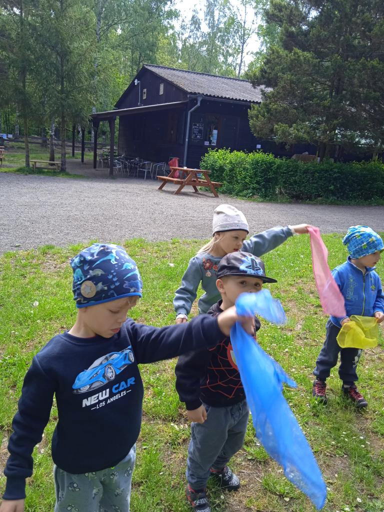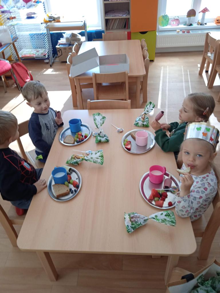 Dnes oslavila Natálka narozeniny a Jaroušek svátek a dětem přinesli vskutku originální dárečky, Natálka spoustu ovoce, modelínu a foukačku a Jaroušek vynikající "nanuky" a lízátka. Nakonec jsme šli cvičit do kempu, kde si děti vyzkoušely výskok s rozběhem na zavěšený zvoneček, cvičily se šátkem,