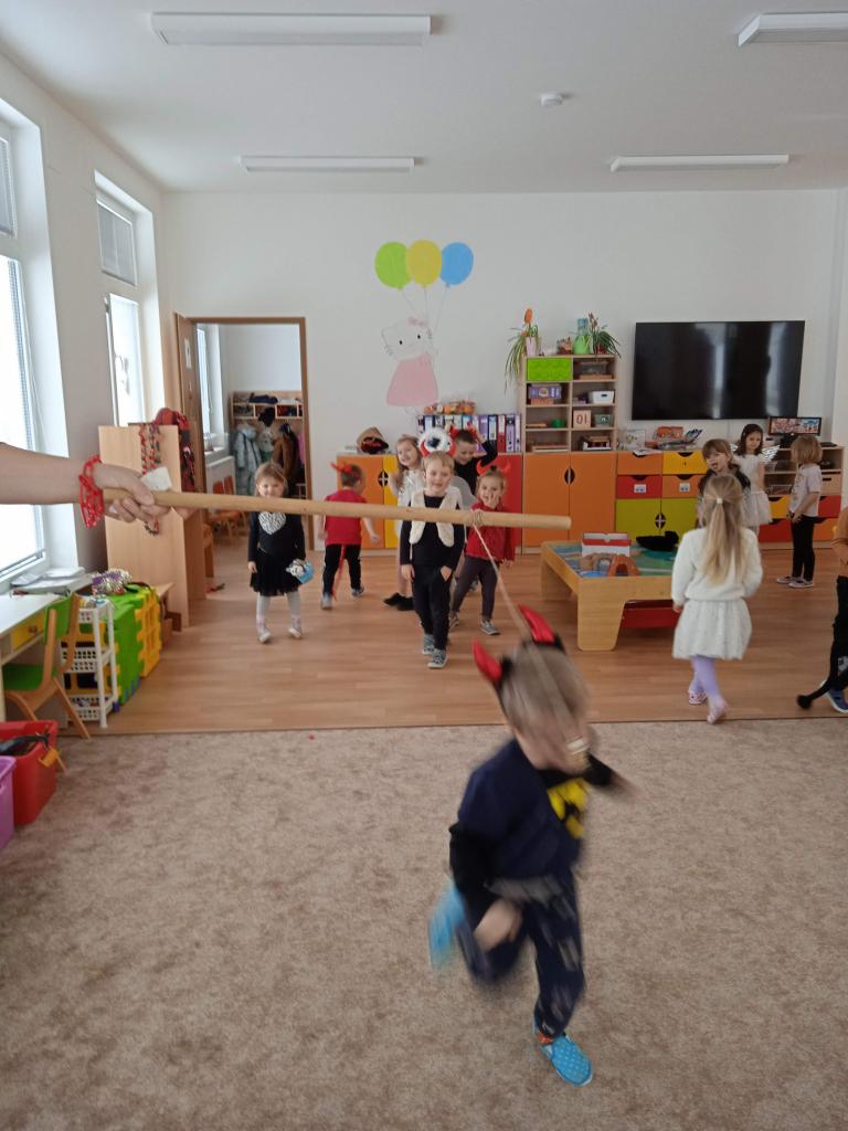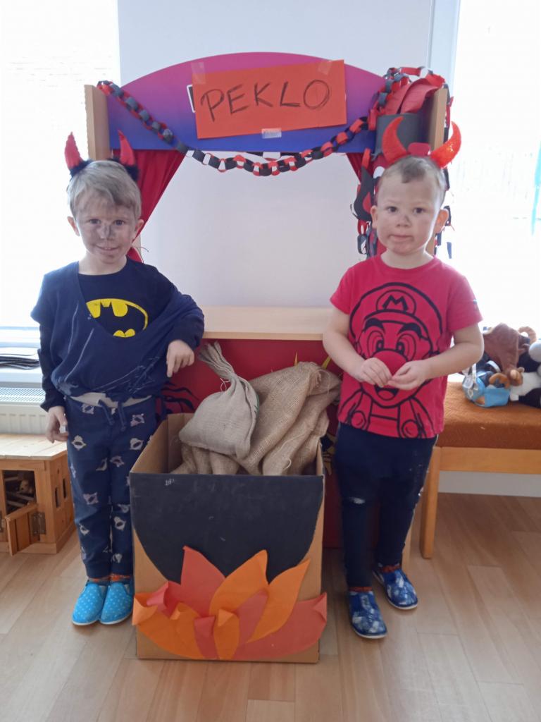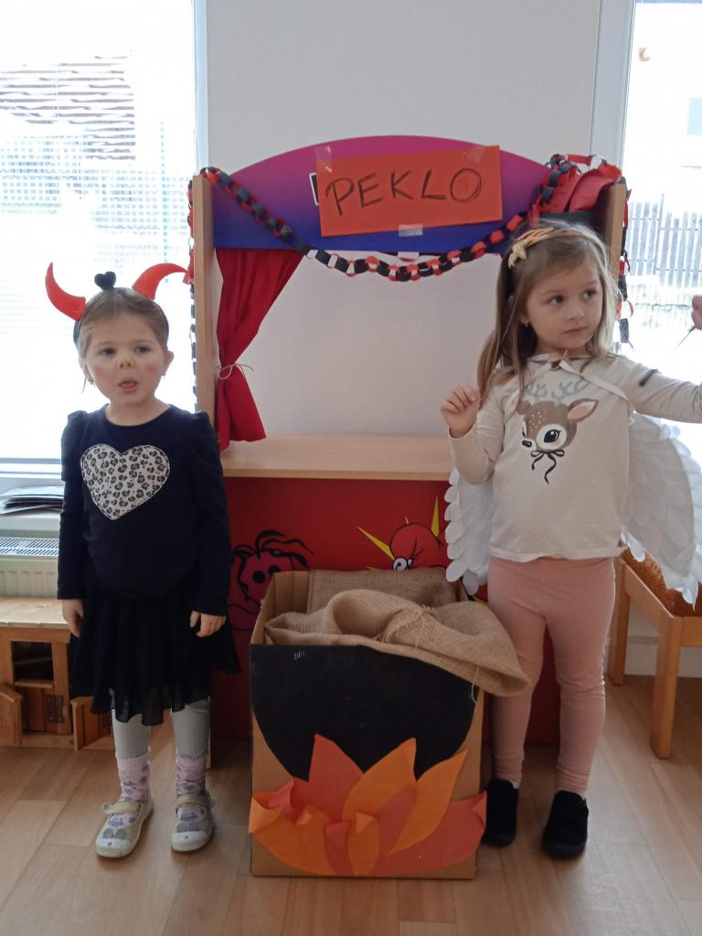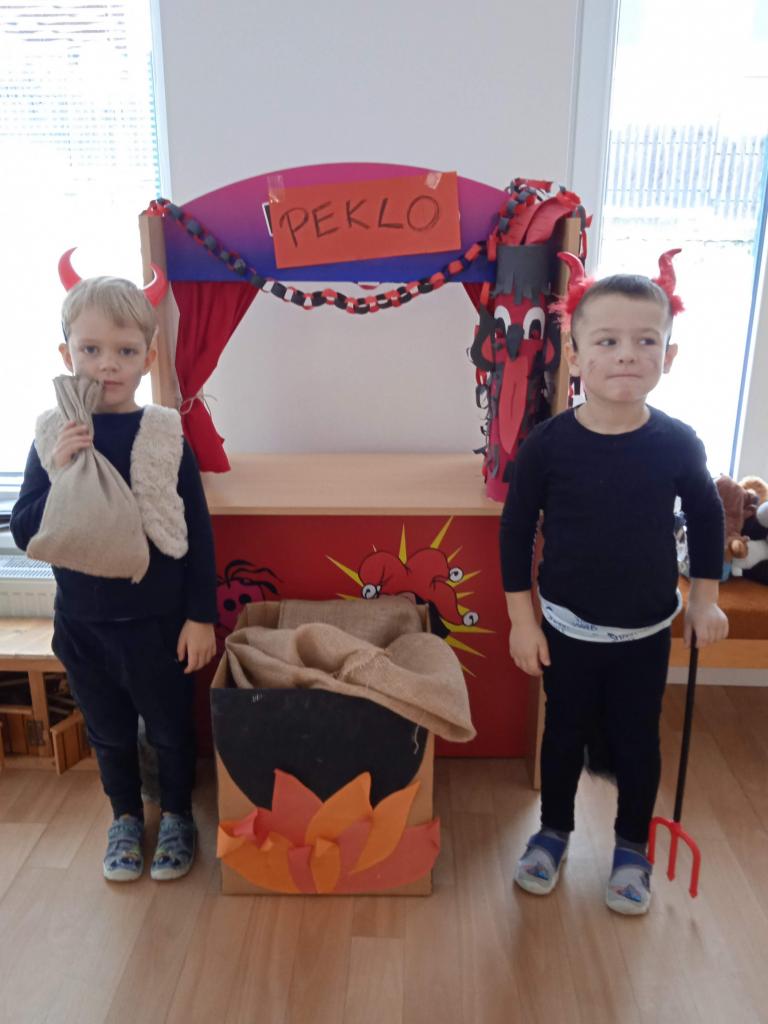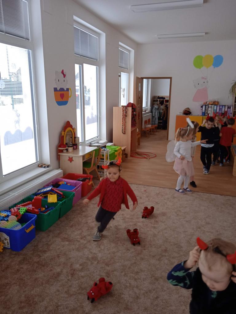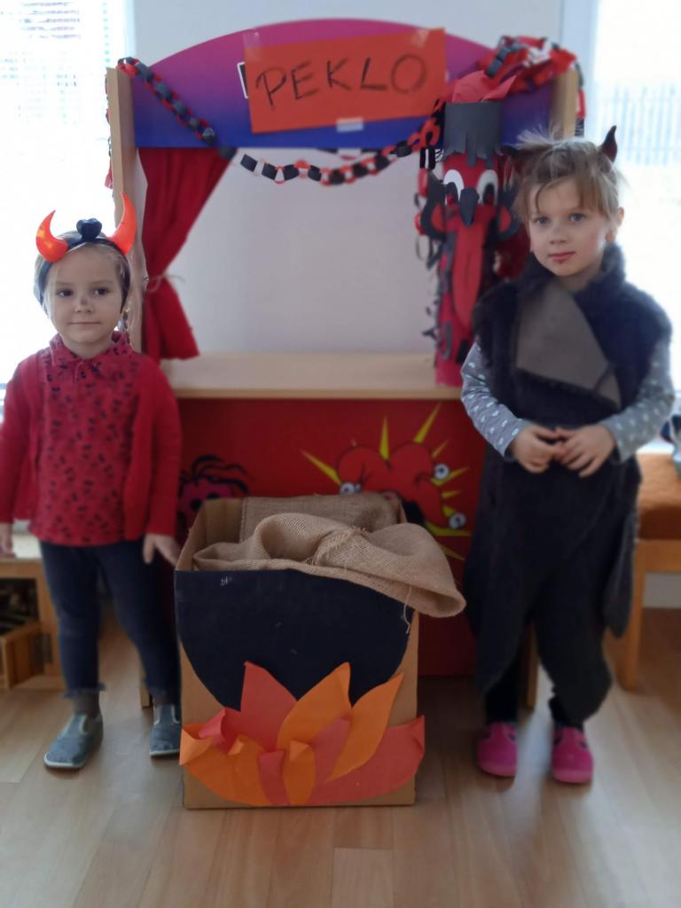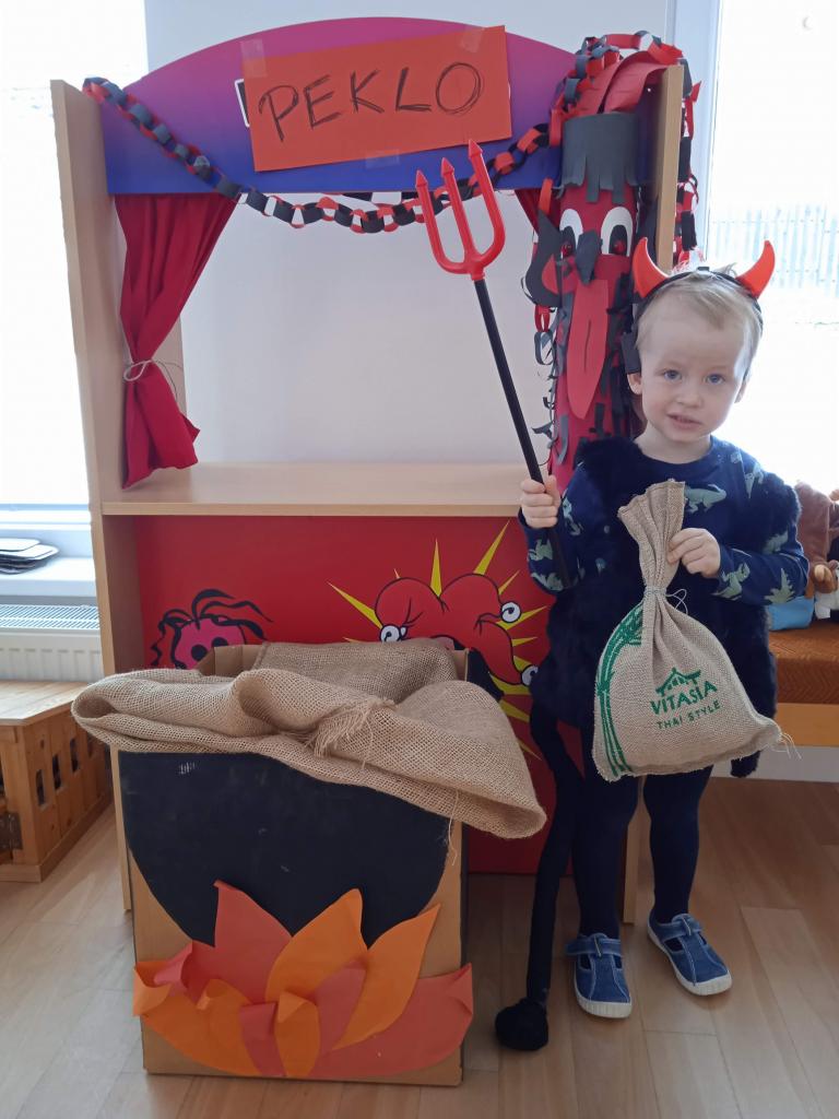 Děti z Koťátek si přinesly převleky čertíků a andílků a od rána si hrály v "Pekle", zdobily třídu řetězy a pekelnými doplňky. Naštěstí k nám přilétli čtyři andílkové. Děti si po svačince zazpívaly Dobré ráno čerti a pustili se do disciplín v družstvech: hod koulí do kotle, slalom mezi čerty, ....
