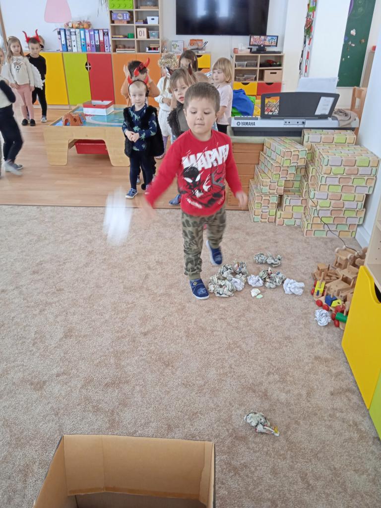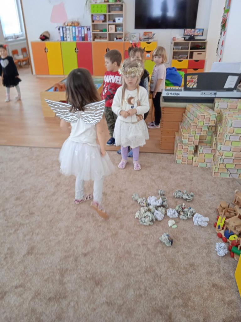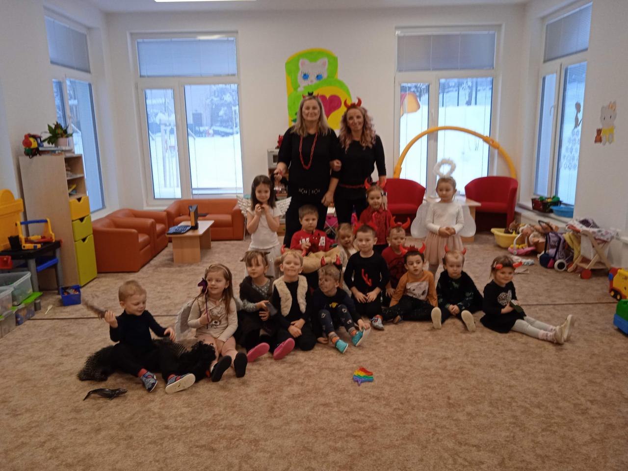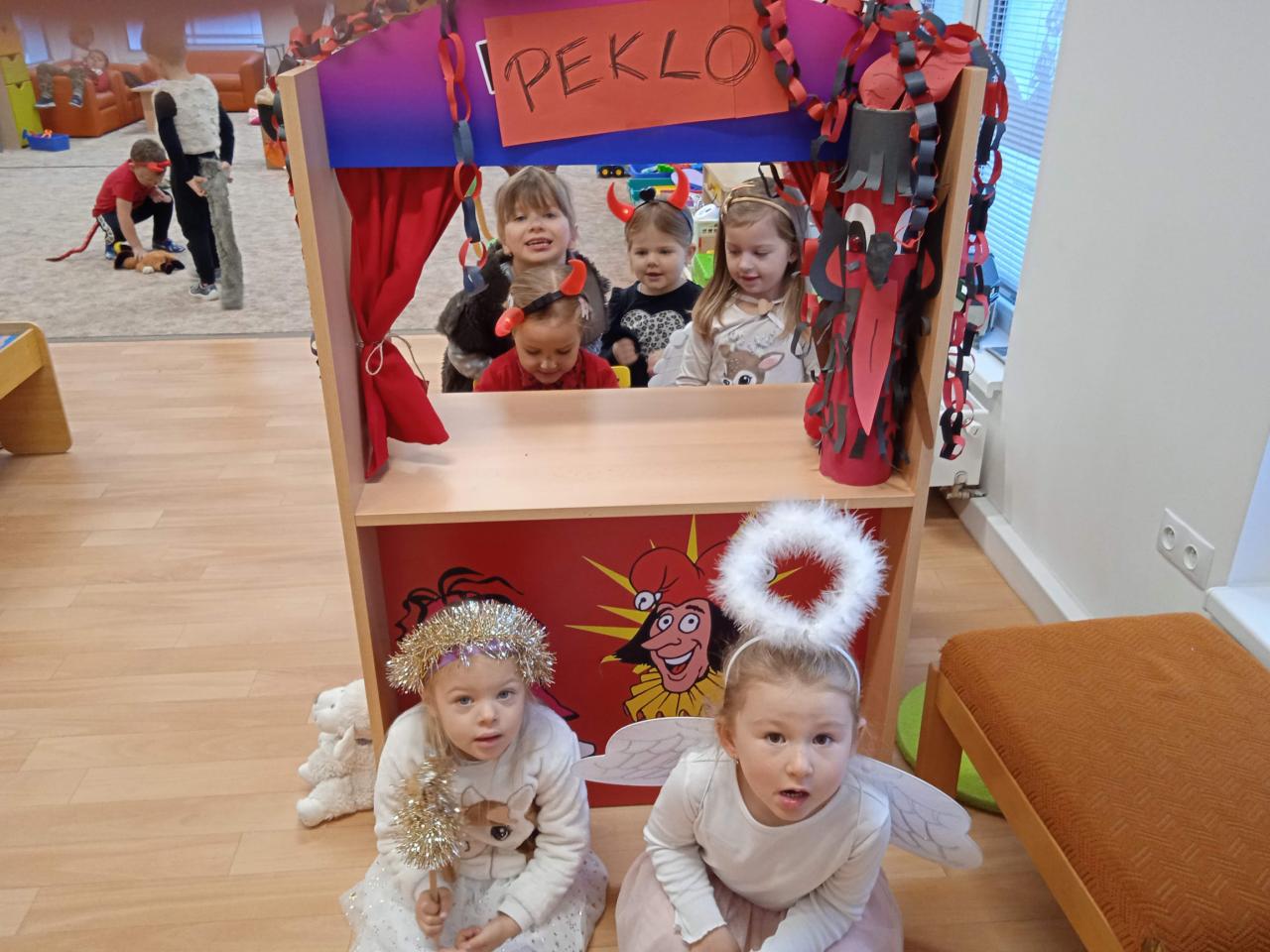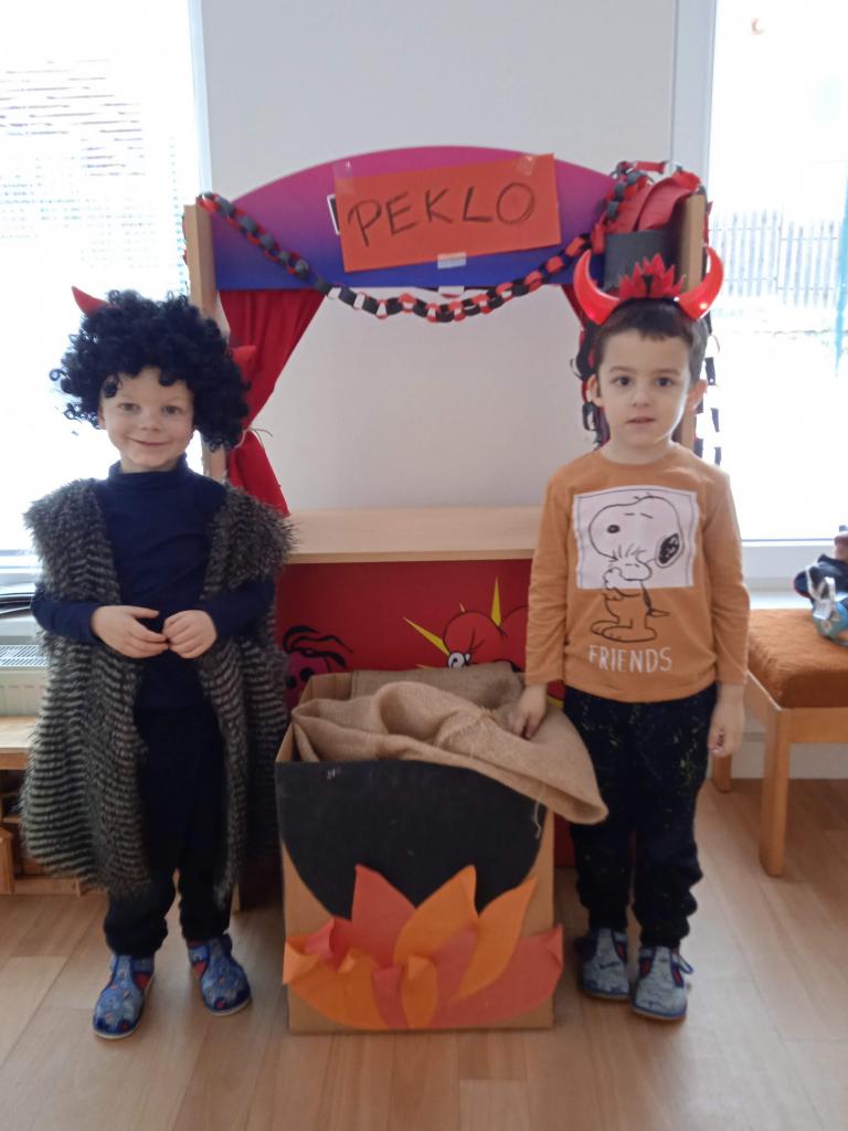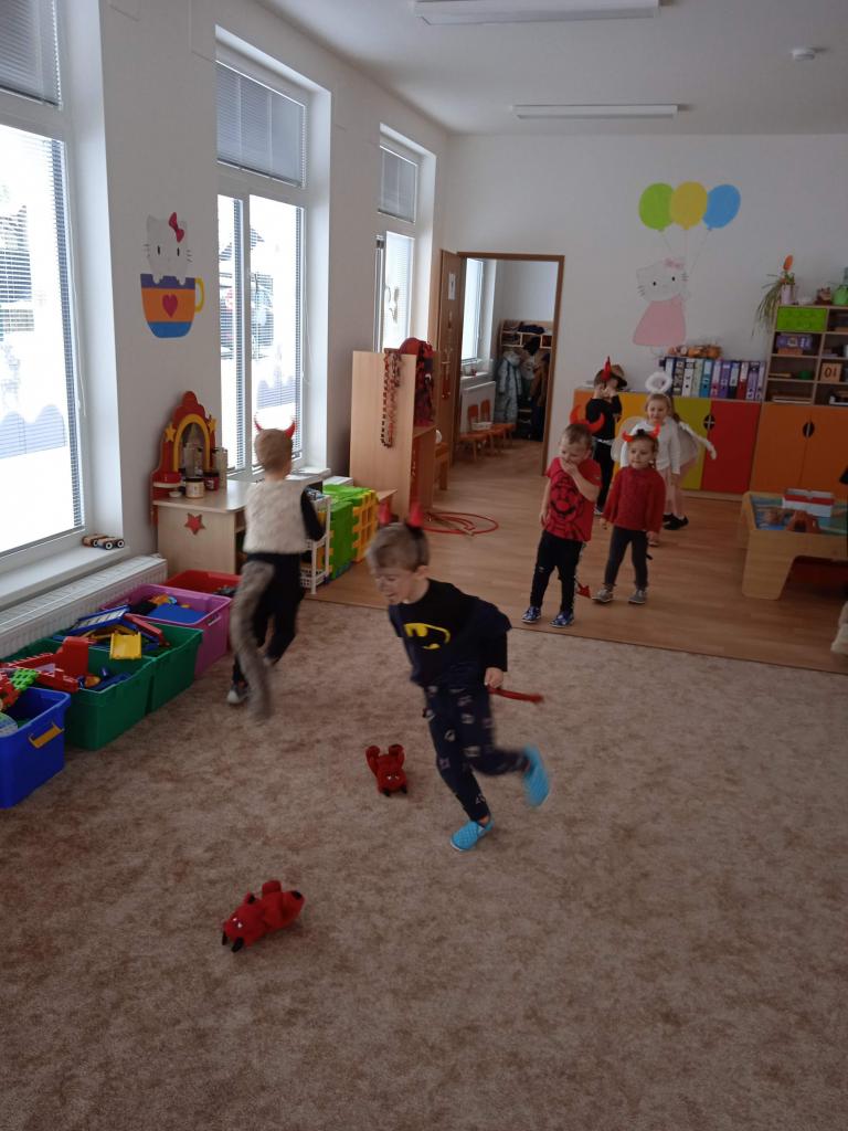 Děti z Koťátek si přinesly převleky čertíků a andílků a od rána si hrály v "Pekle", zdobily třídu řetězy a pekelnými doplňky. Naštěstí k nám přilétli čtyři andílkové. Děti si po svačince zazpívaly Dobré ráno čerti a pustili se do disciplín v družstvech: hod koulí do kotle, slalom mezi čerty, ....
