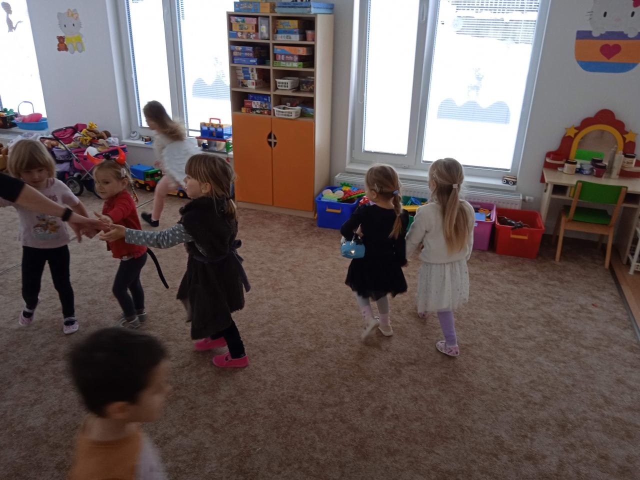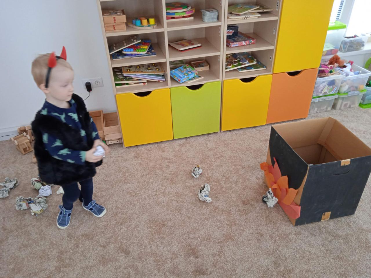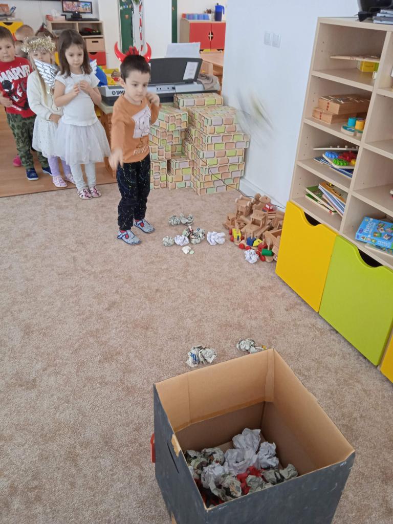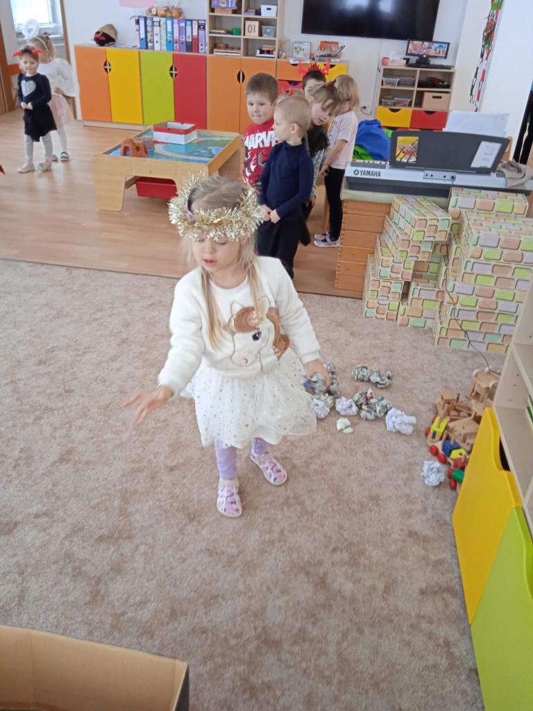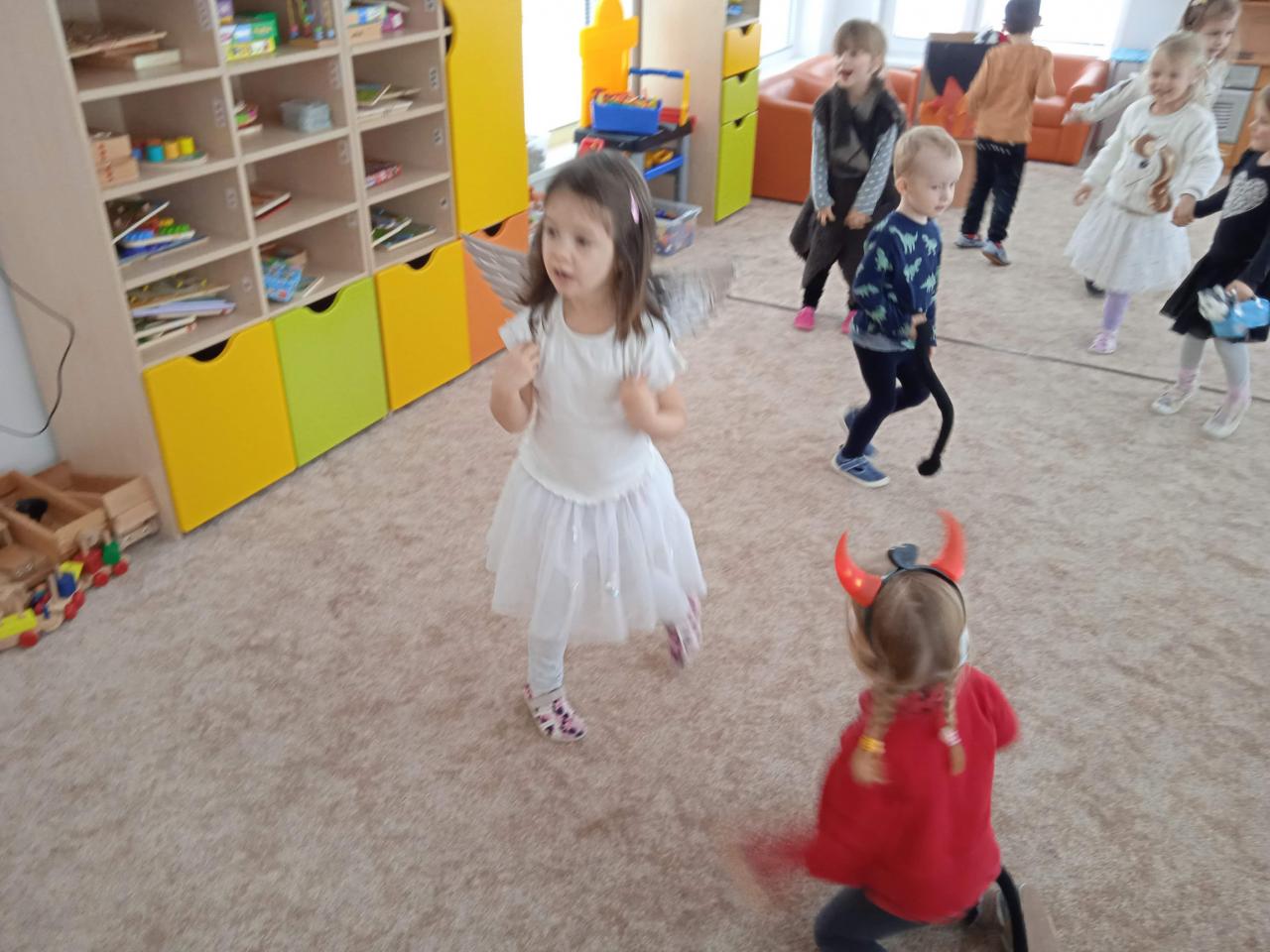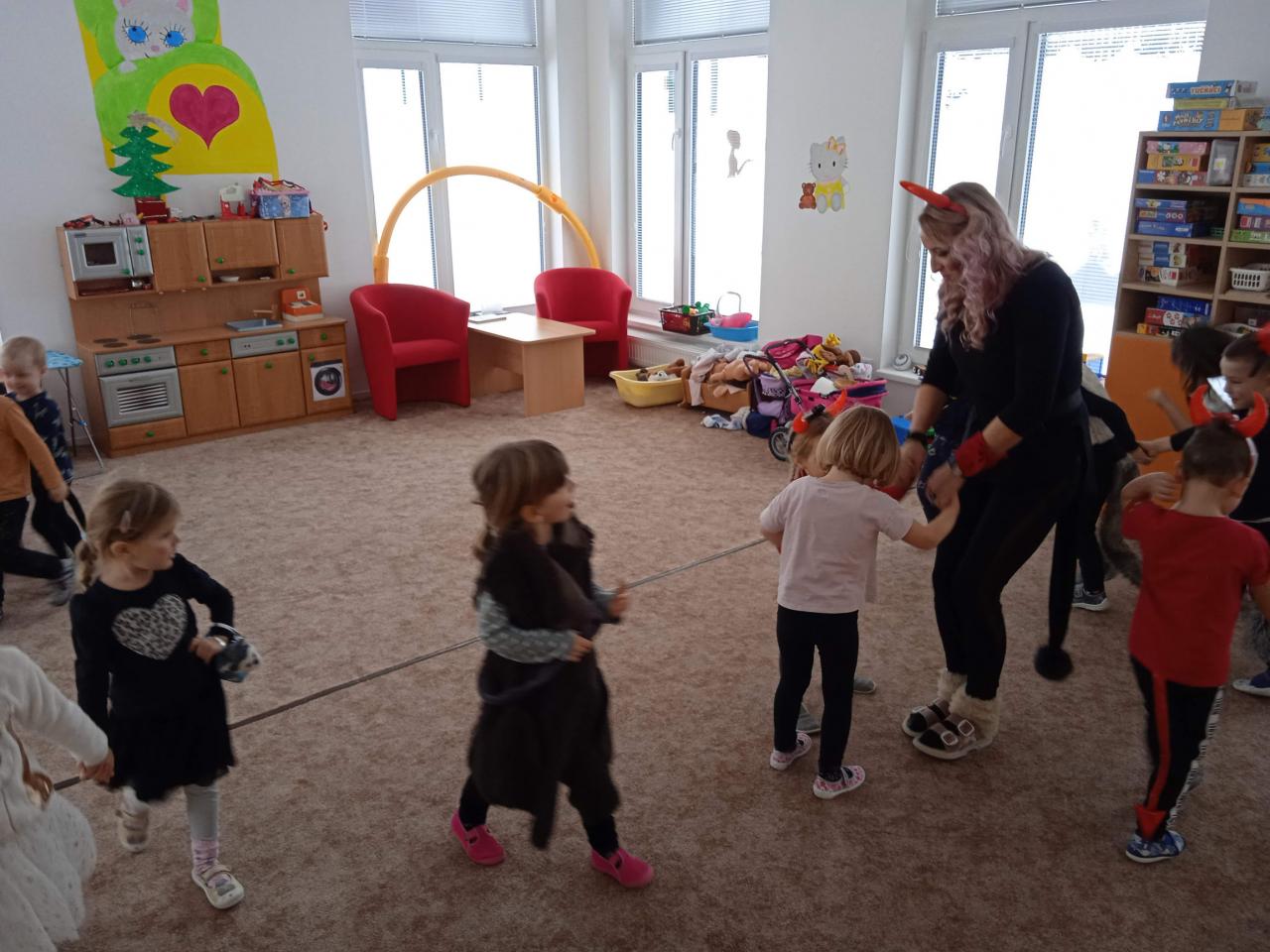 Děti z Koťátek si přinesly převleky čertíků a andílků a od rána si hrály v "Pekle", zdobily třídu řetězy a pekelnými doplňky. Naštěstí k nám přilétli čtyři andílkové. Děti si po svačince zazpívaly Dobré ráno čerti a pustili se do disciplín v družstvech: hod koulí do kotle, slalom mezi čerty, ....