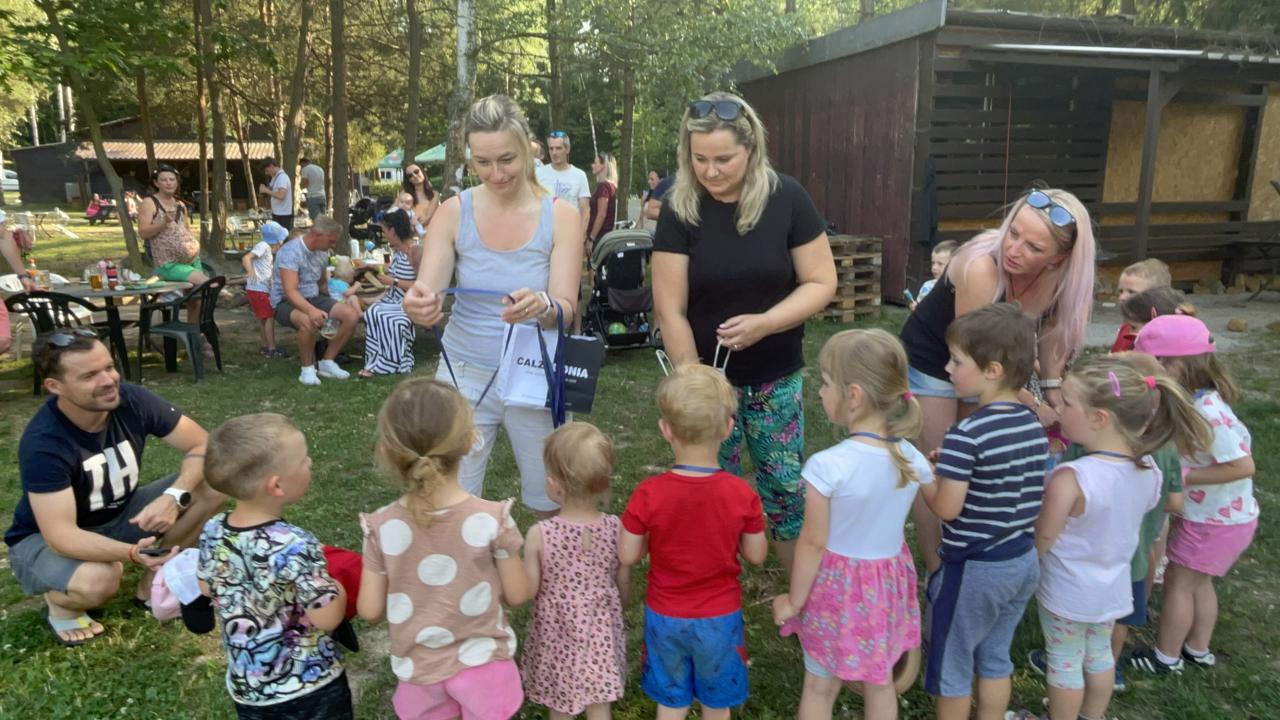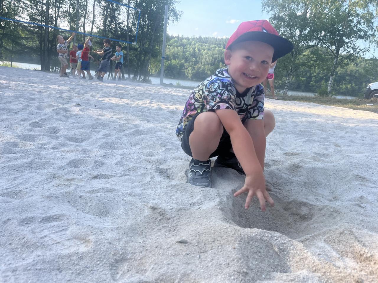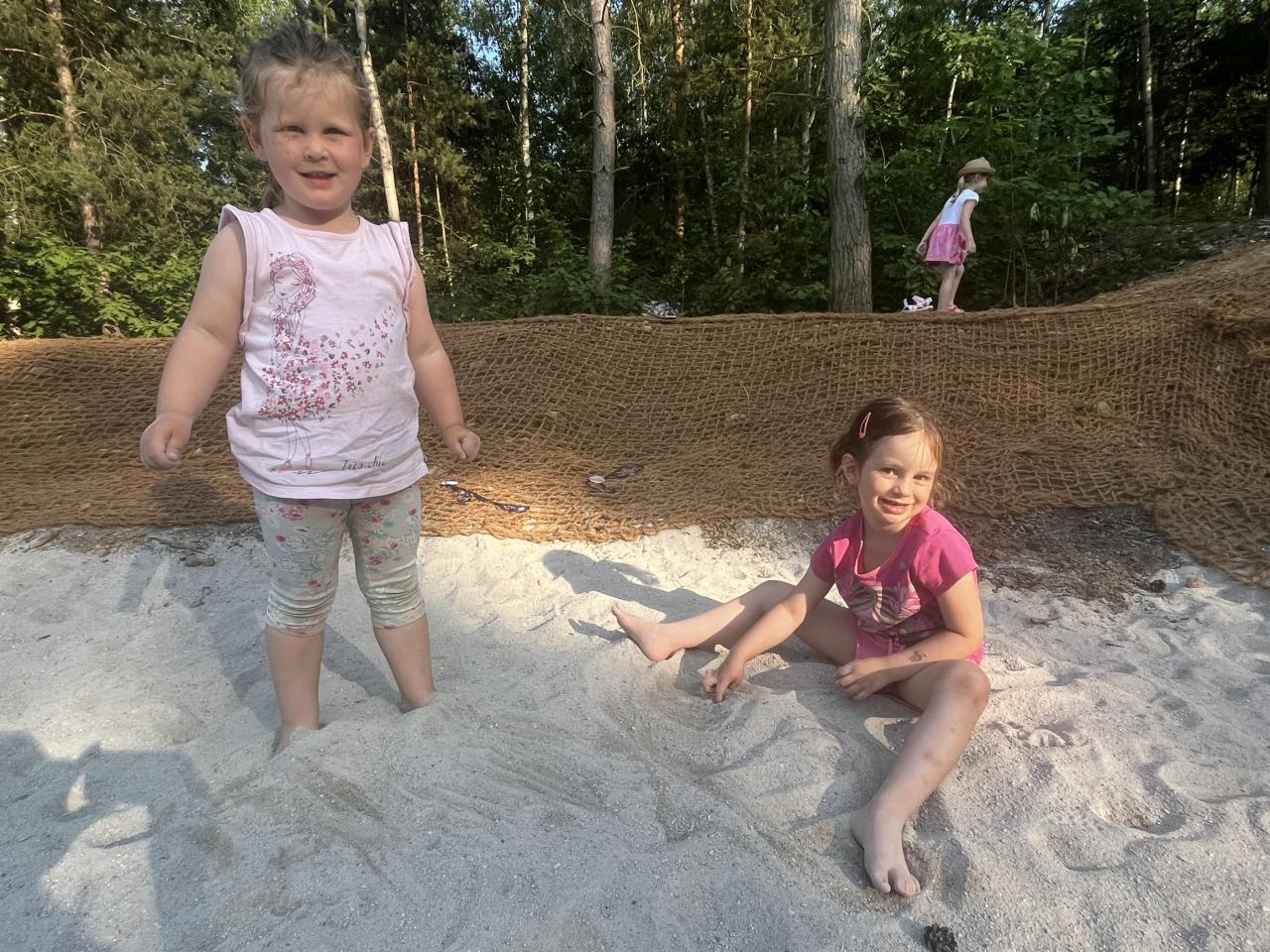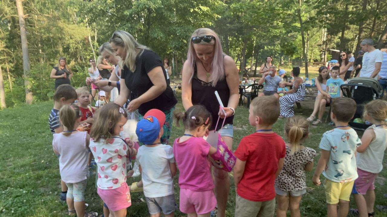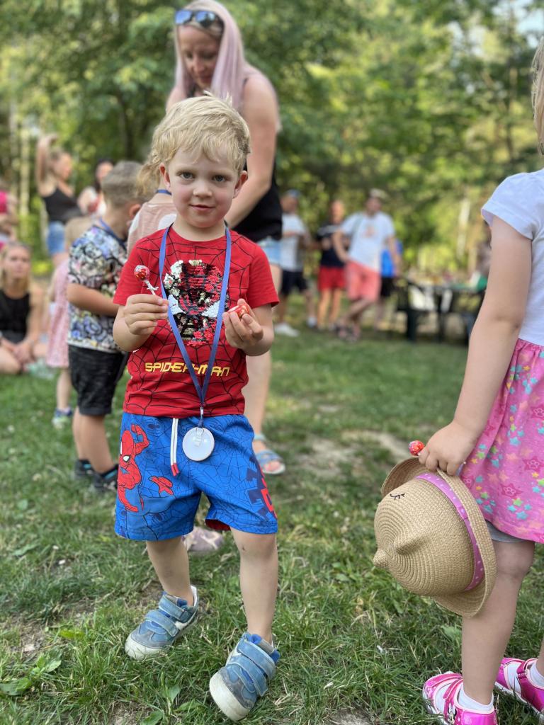 .. opekli buřtíky a poté jim děti zazpívaly červnovou píseň Jede jede... Děti dostaly krásné medaile, které zařídila Jonáškovo maminka, čímž jí ještě jednou moc děkujeme. V průběhu odpoledne se děti vyřádily na beach hřišti a houpačkách.