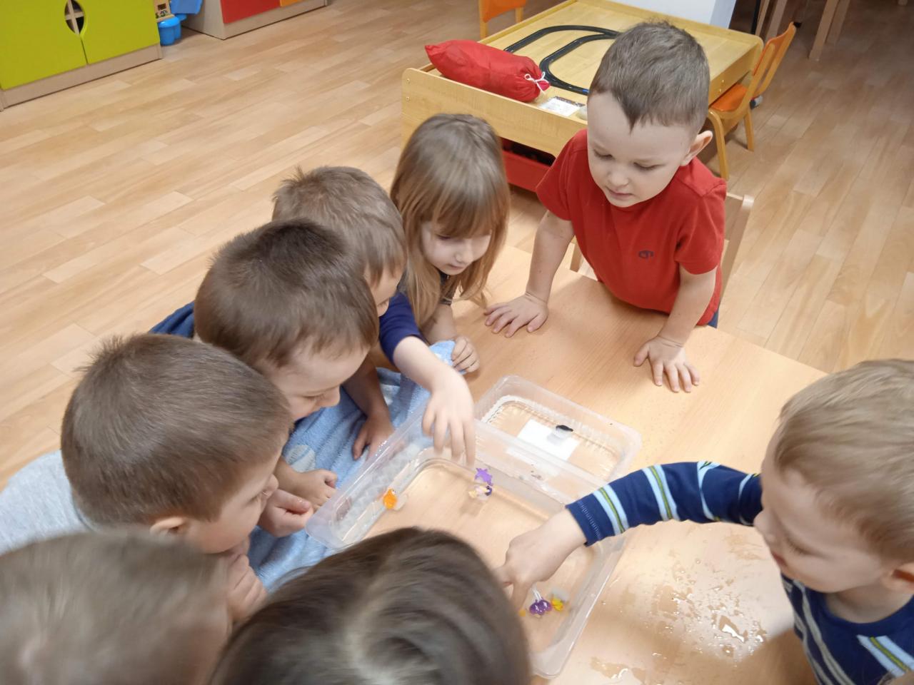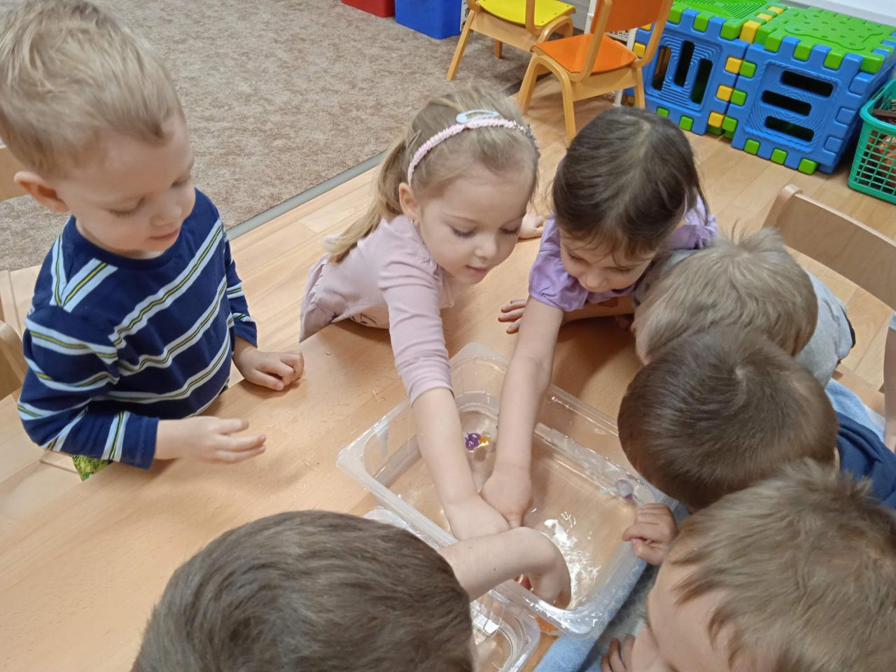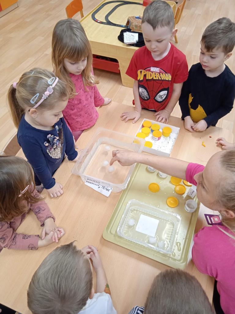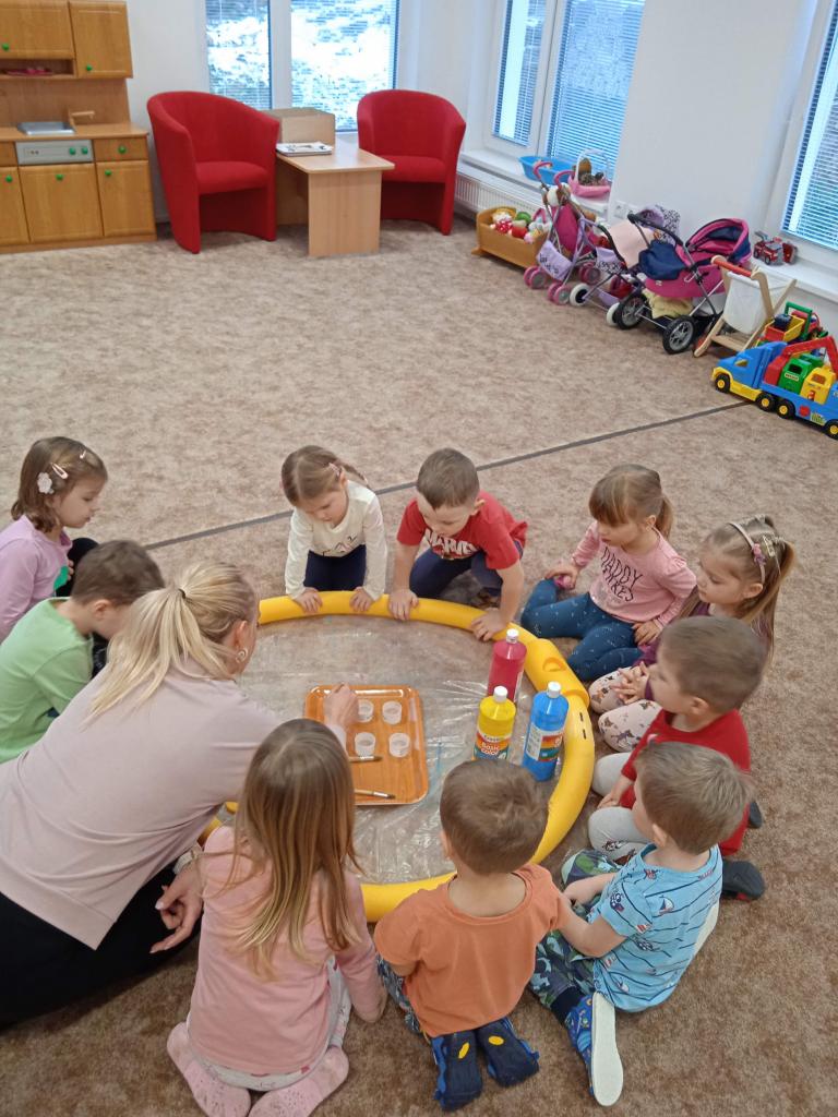 .. první pokus bylo pozorování tání sněhu ve sklenici, další bylo obarvení vody základními barvami, zmrznutí "za oknem" a míchání barevných ledíků dohromady, poté pozorování, jaké barvy vzniknou táním barev dohromady, též poznávání jak v teplé a studené vodě ledy tají a překvapení s ledovými pidihračkami. Vše jsme završili cvičením ve vločkovém a sněhulákovém duchu s různými pomůckami (padák s "koulí" bavil děti asi nejvíce).