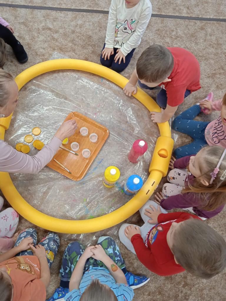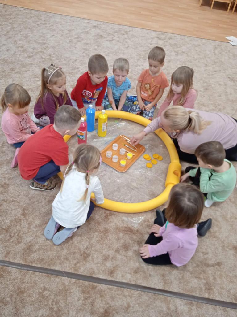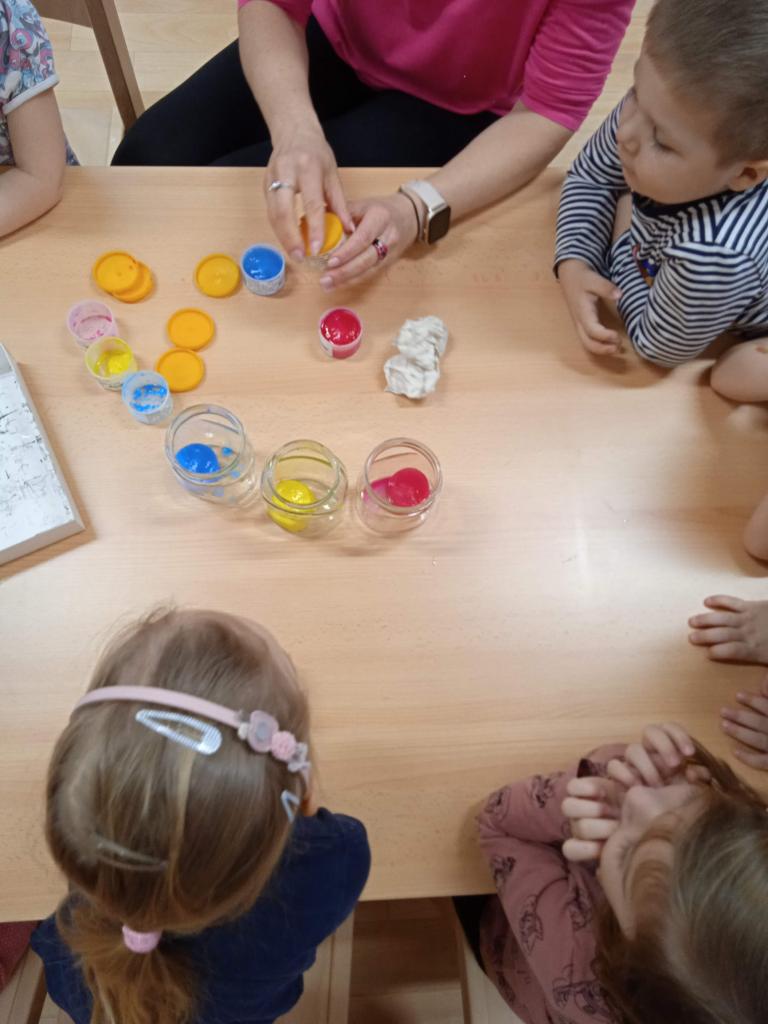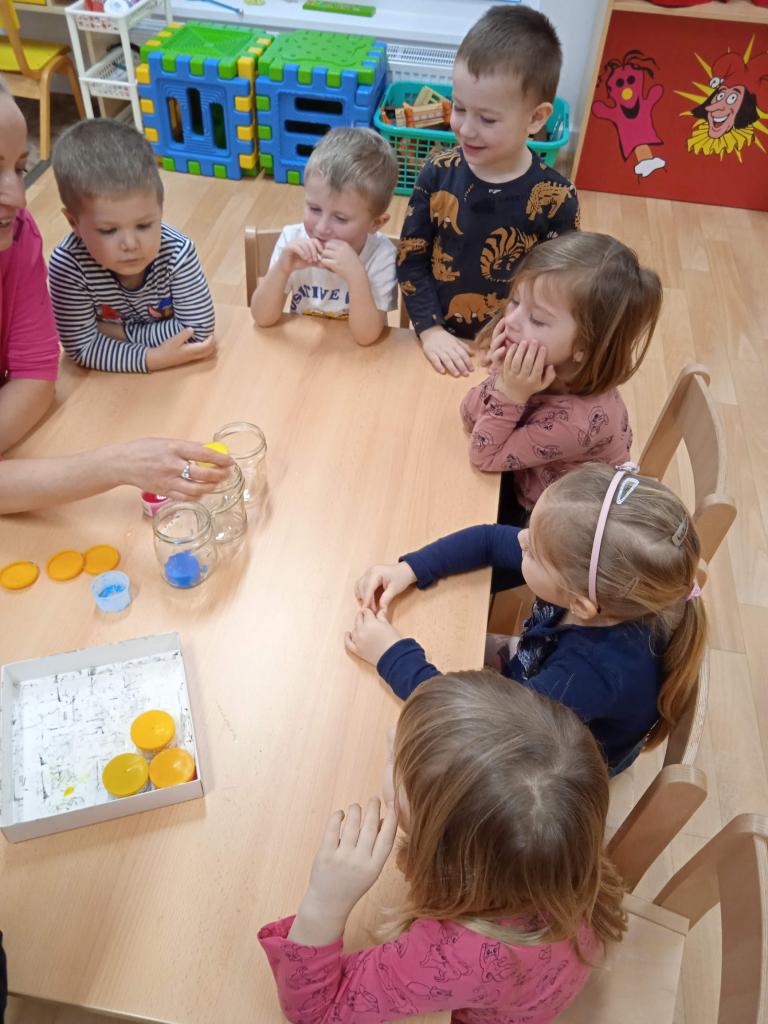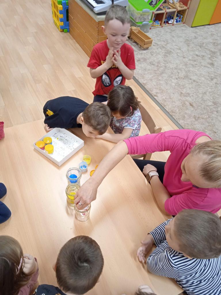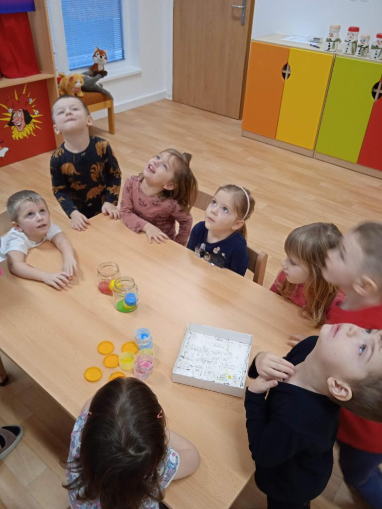 .. první pokus bylo pozorování tání sněhu ve sklenici, další bylo obarvení vody základními barvami, zmrznutí "za oknem" a míchání barevných ledíků dohromady, poté pozorování, jaké barvy vzniknou táním barev dohromady, též poznávání jak v teplé a studené vodě ledy tají a překvapení s ledovými pidihračkami. Vše jsme završili cvičením ve vločkovém a sněhulákovém duchu s různými pomůckami (padák s "koulí" bavil děti asi nejvíce).