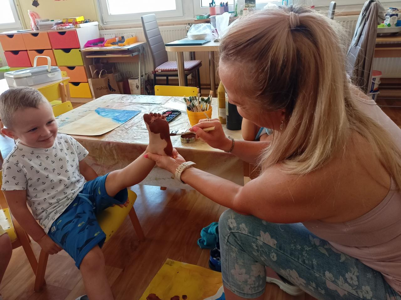 Ráno jsme obtiskli nožky dětí na "plážový" obrázek, Eliška slavila narozeniny a Domik svátek a narozeniny. Potom jsme šli na procházku ke kaštanu,kde si děti hezky hráli ve stínu.