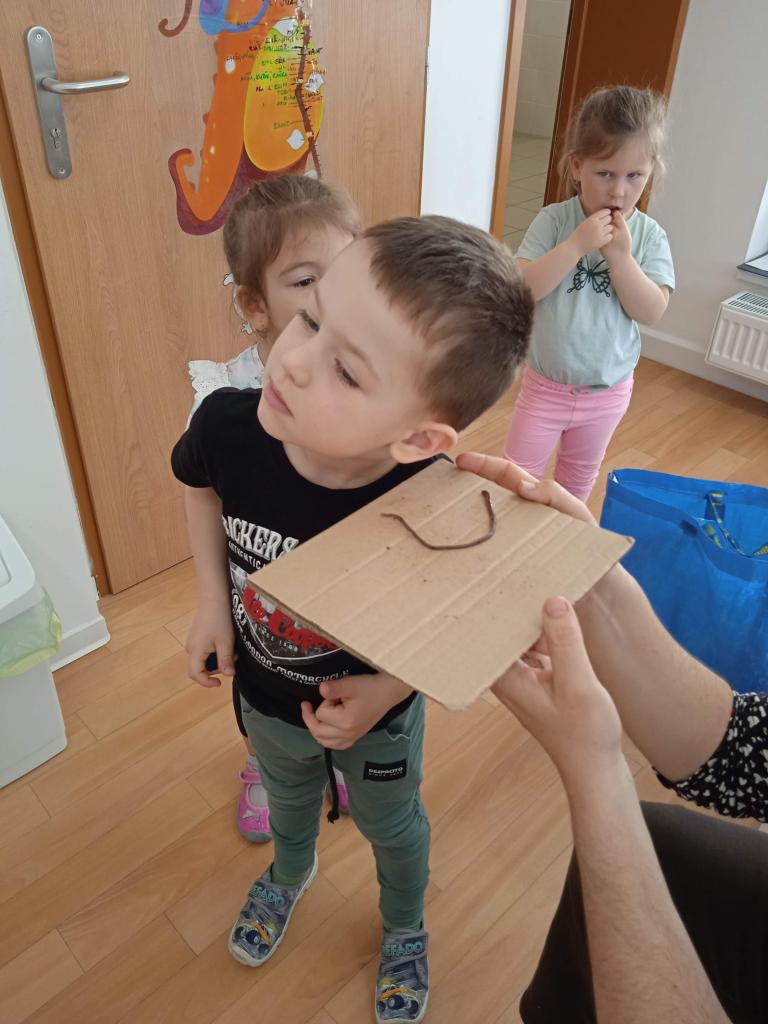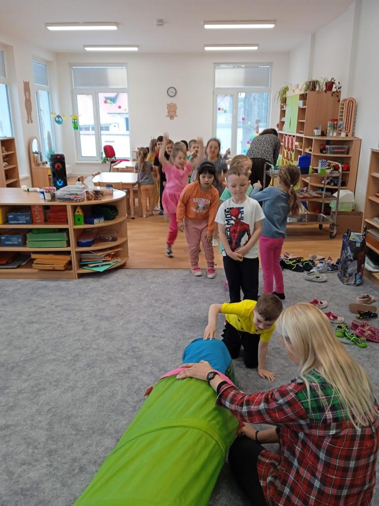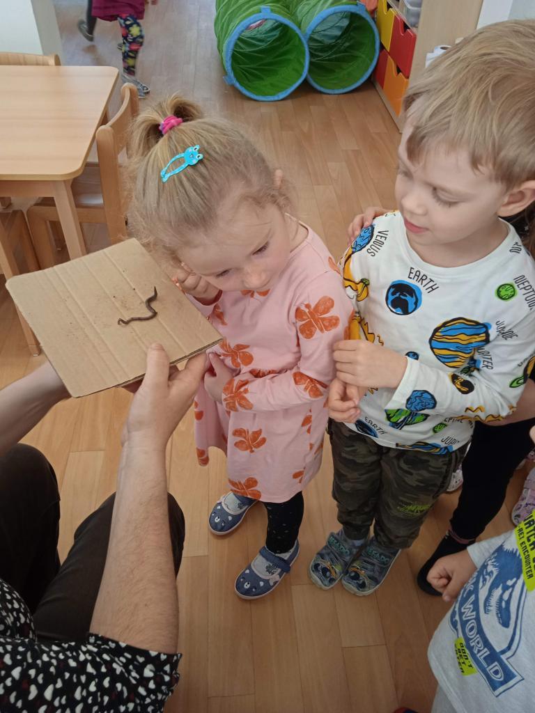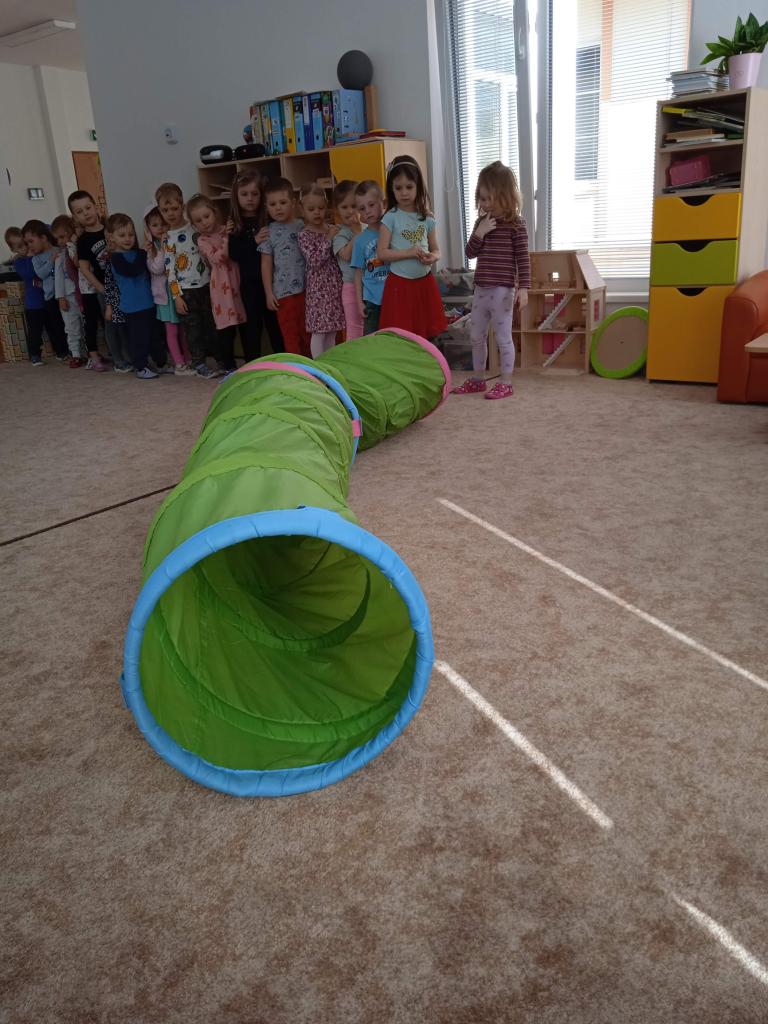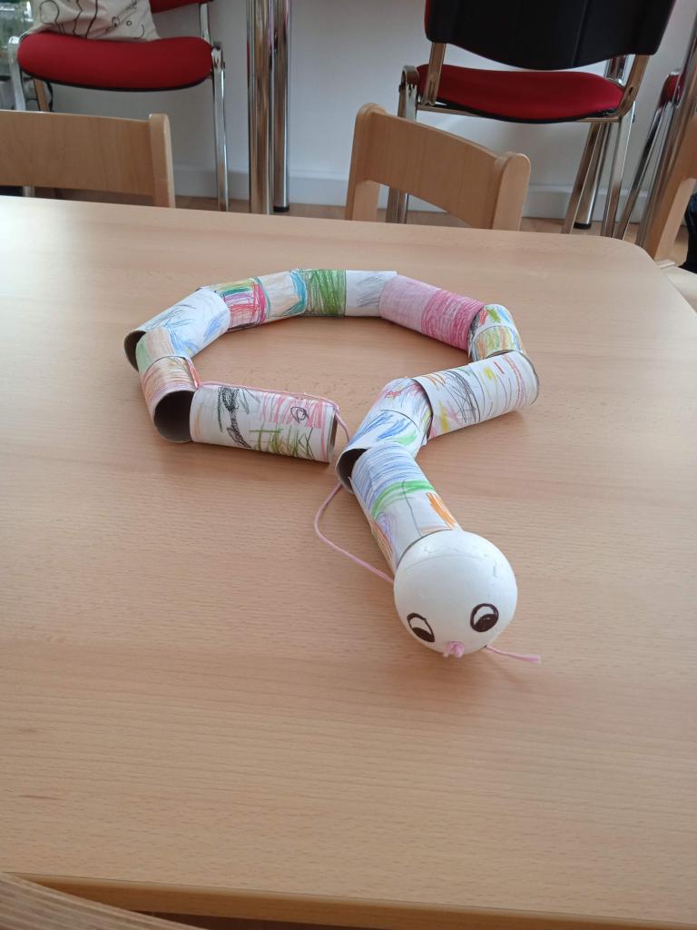 Děti si také vyrobily krásnou žížalu "Otylku" z roliček od papíru a nabarvily jí dle fantazie a na žížalky si zahrály při prolézání látkového tunelu.