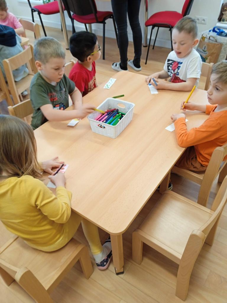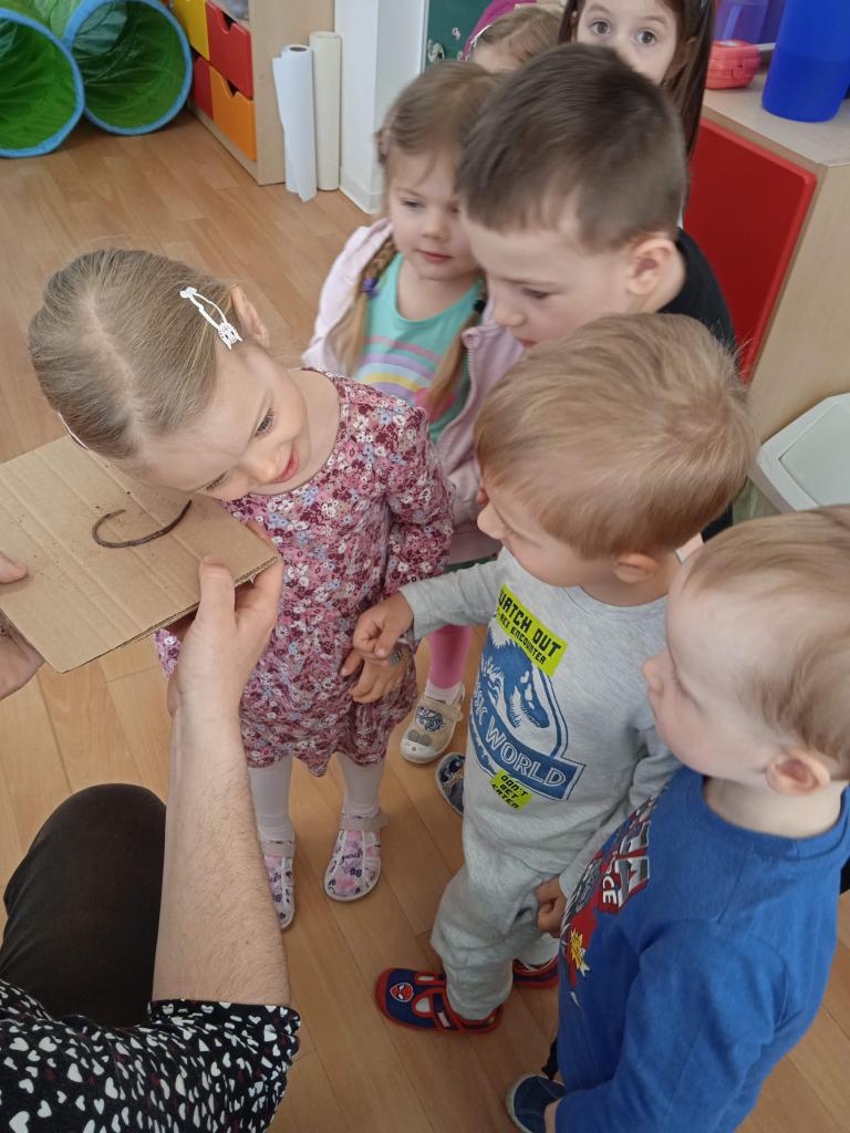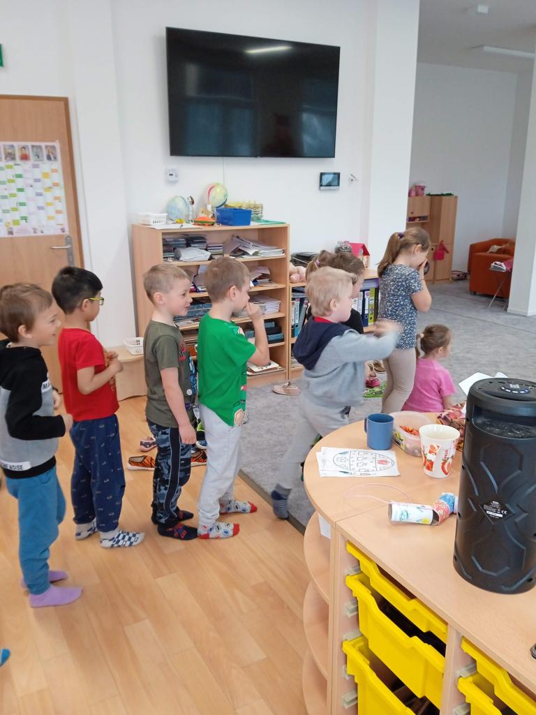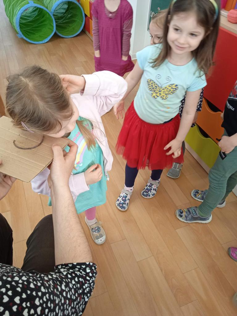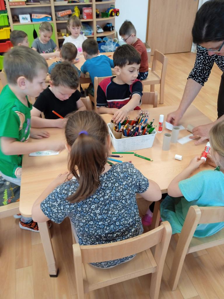 Děti si také vyrobily krásnou žížalu "Otylku" z roliček od papíru a nabarvily jí dle fantazie a na žížalky si zahrály při prolézání látkového tunelu.