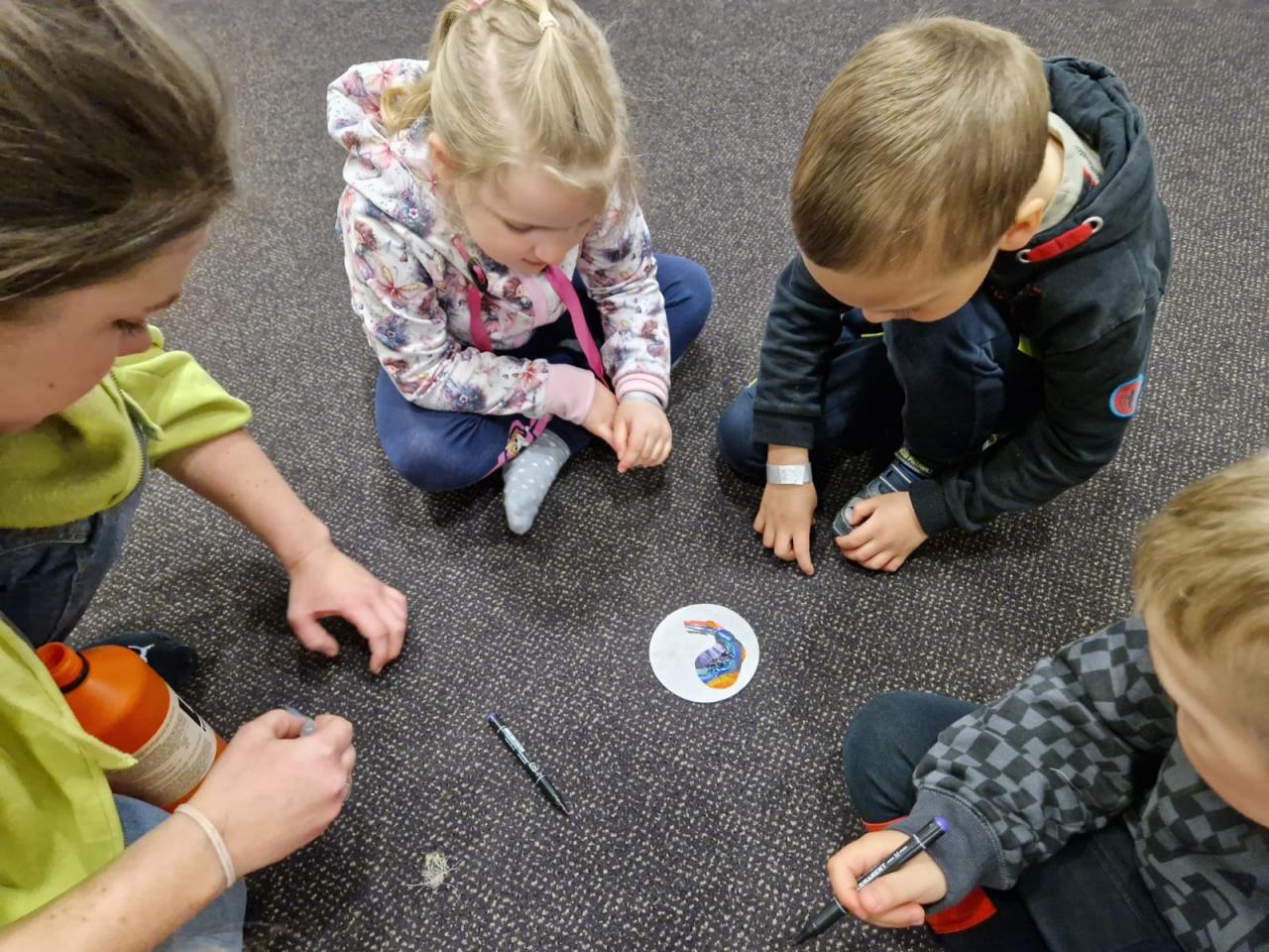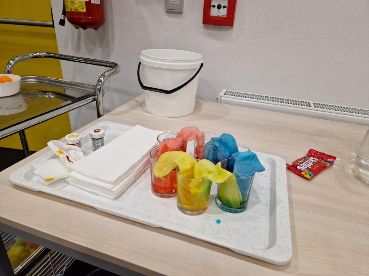 2) Druhá skupina měla téma Barvy kolem nás : zde děti nejprve pojemenovaly barvy, třídily barevné bambulky do mističek stejné barvy, kreslily lihovým fixem a následně rozpíjely barvy pomocí technického lihu, nasávaly barvy papírovými kapesníky, které míchaly mezi jednotlivými sklenicemi s barvou - vznikaly tak barvy duhy.