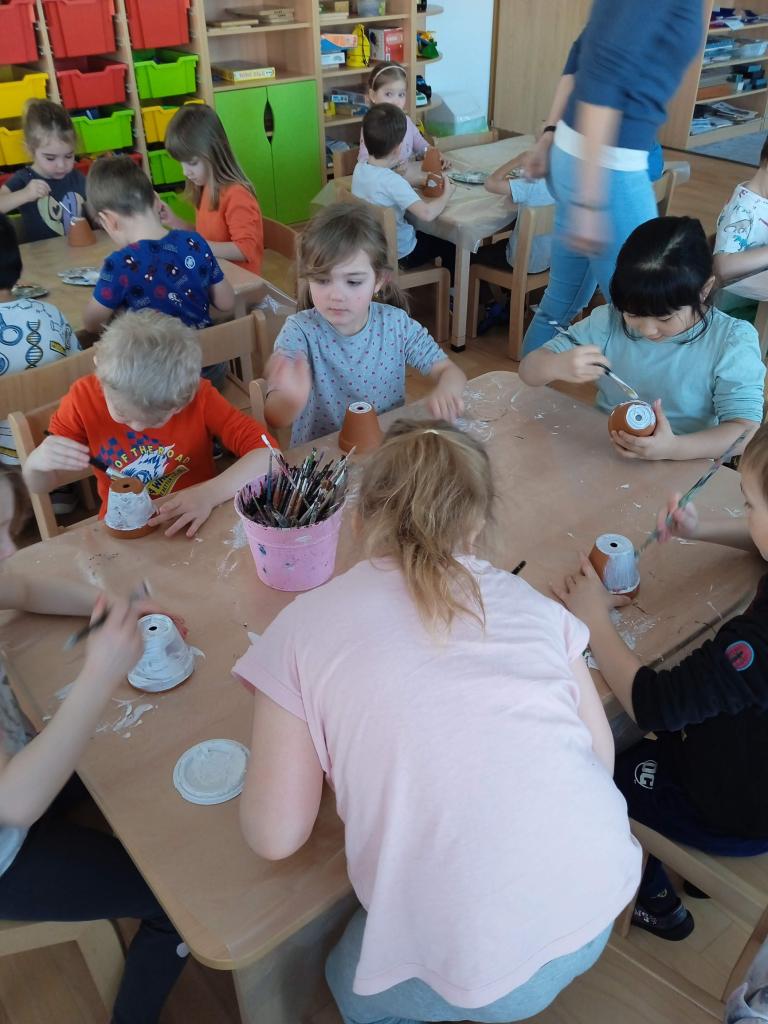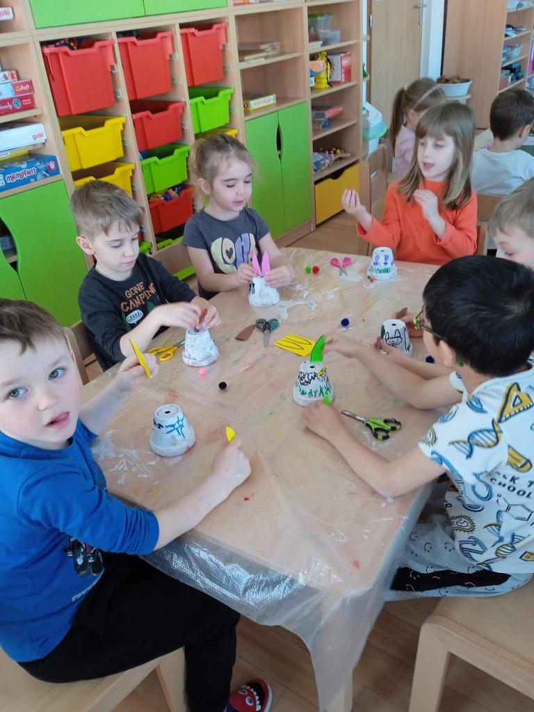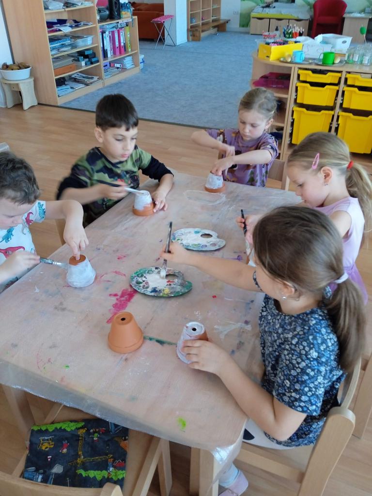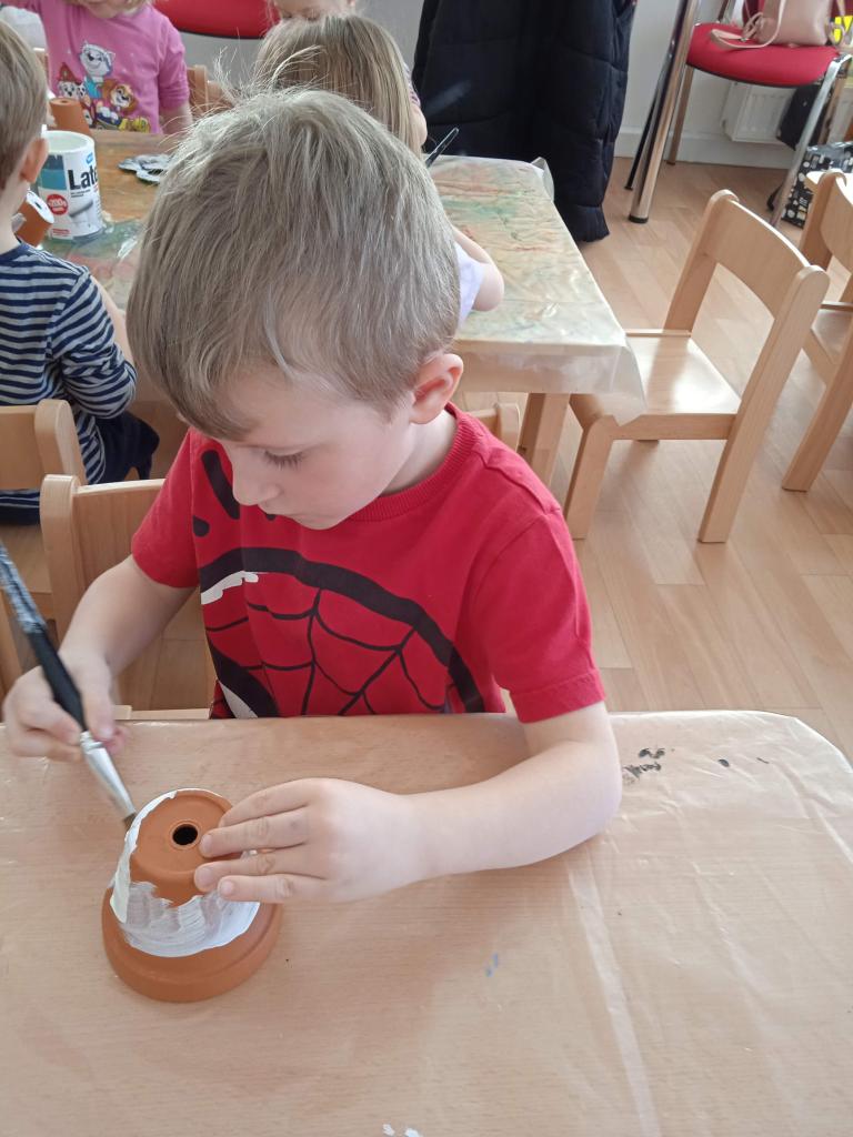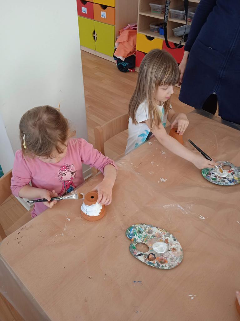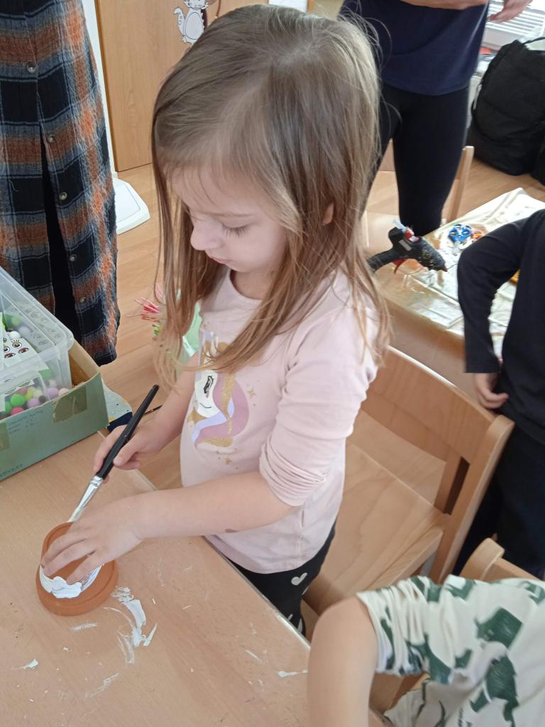 V úterý nás navštílila paní z Kolorky v Rokycanech, kdy si děti vyrobily krásného zajíčka z květníku, který si sami natřely akrylovou barvou, pomalovaly dle fantazie fixou, vystřihly ouška, nalepily oči, nos ocásek a vousky.